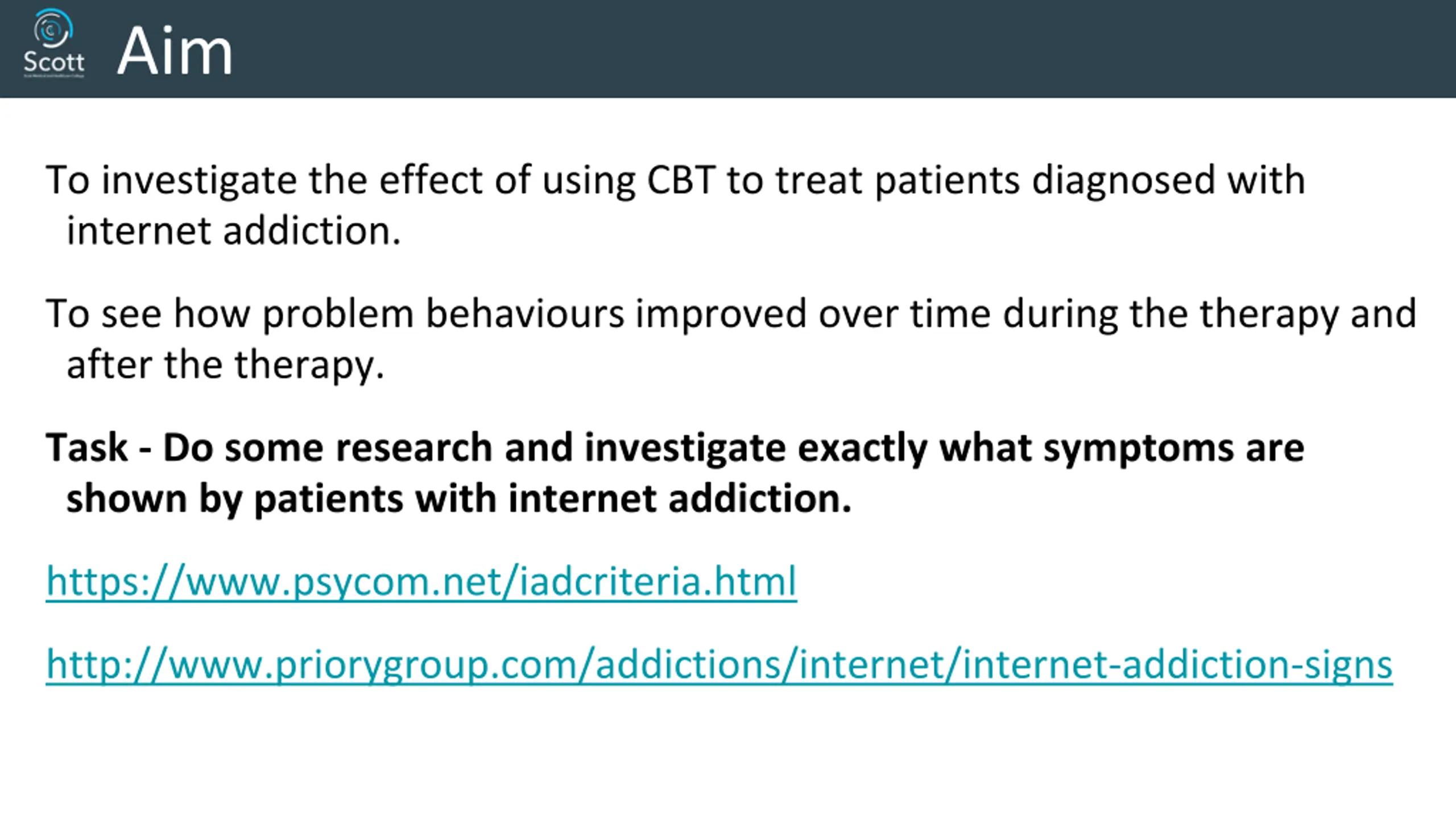 Aim To investigate the effect of using CBT to treat patients diagnosed with internet addiction. To see how problem behaviours improved over time during the therapy and after the therapy. Task - Do some research and investigate exactly what symptoms are shown by patients with internet addiction. https://www.psycom.net/iadcriteria.html http://www.priorygroup.com/addictions/internet/internet-addiction-signs