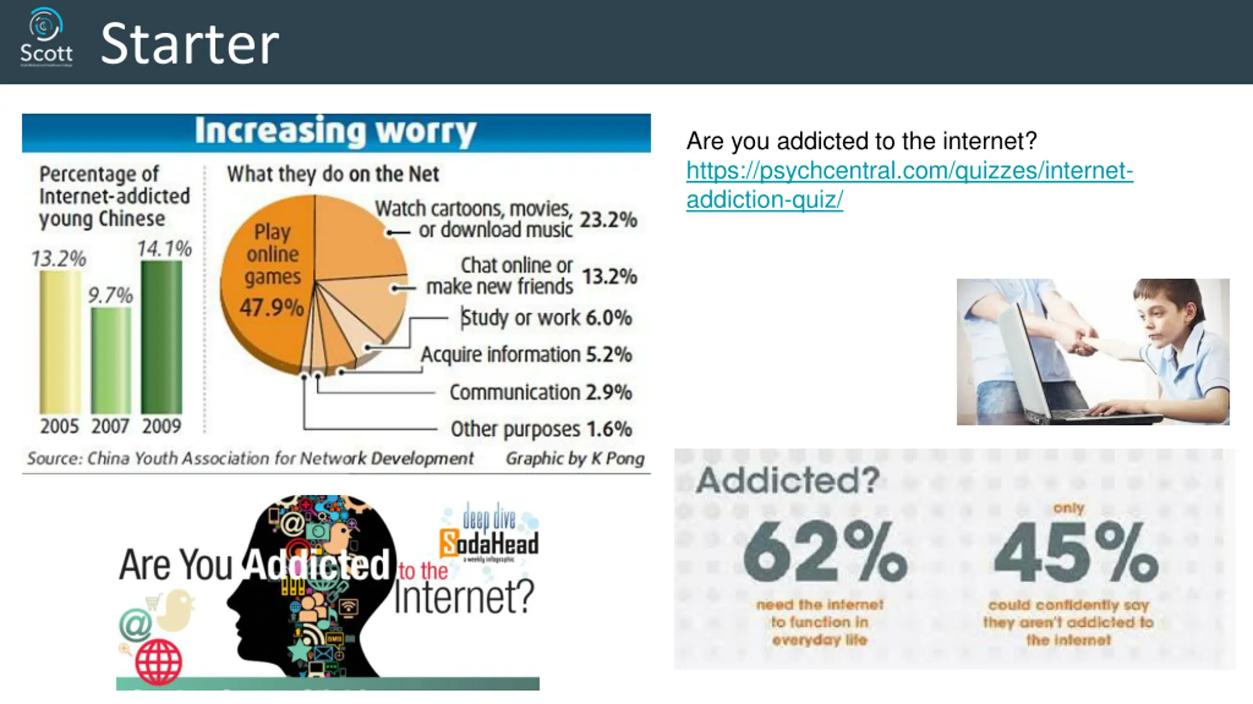 Starter Are you addicted to the internet? https://psychcentral.com/quizzes/internet- addiction-quiz/