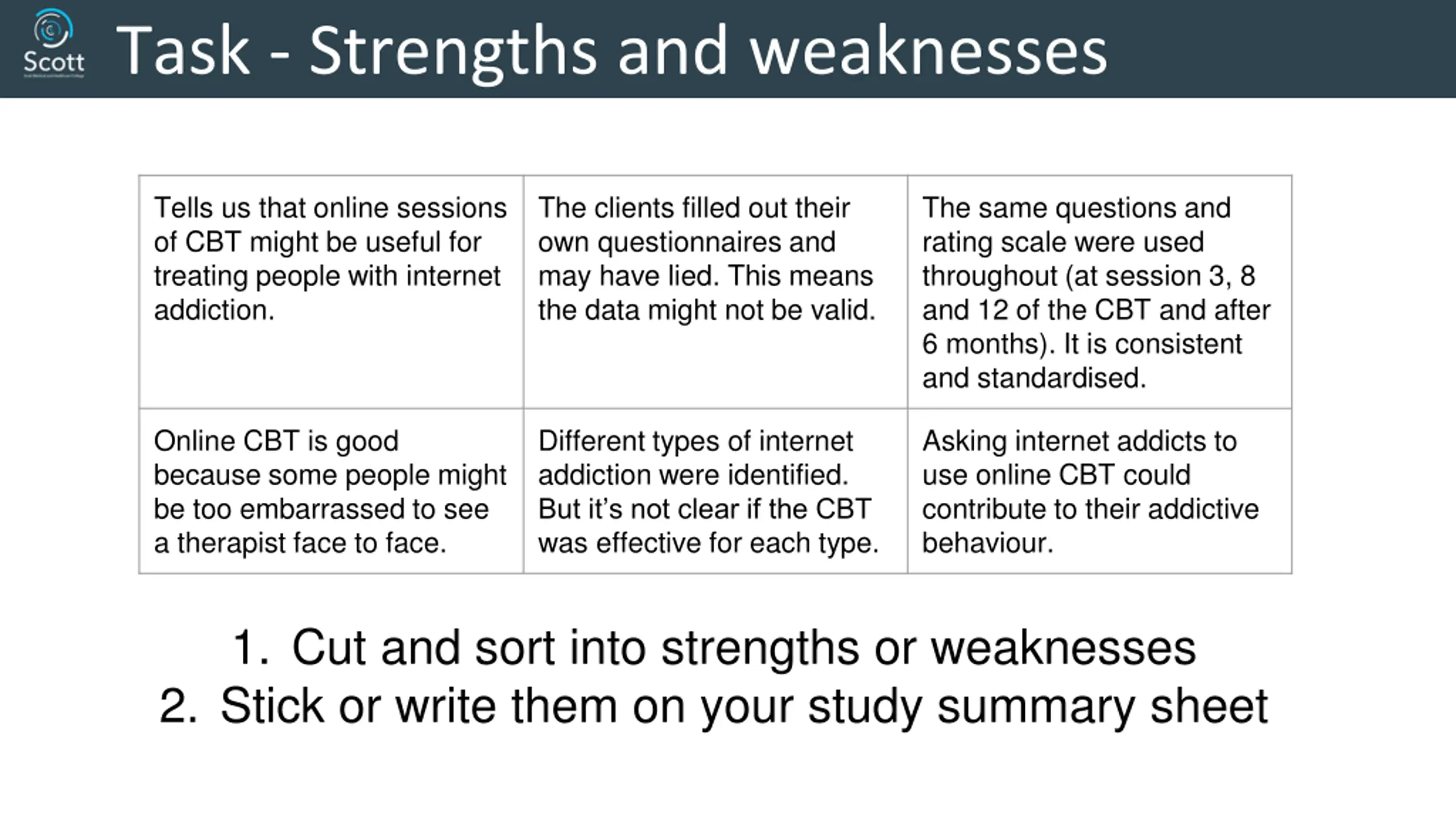 Task - Strengths and weaknesses Tells us that online sessions of CBT might be useful for treating people with internet addiction. The clients filled out their own questionnaires and may have lied. This means the data might not be valid. The same questions and rating scale were used throughout (at session 3, 8 and 12 of the CBT and after 6 months). It is consistent and standardised. Online CBT is good because some people might be too embarrassed to see a therapist face to face. Different types of internet addiction were identified. But it s not clear if the CBT was effective for each type. Asking internet addicts to use online CBT could contribute to their addictive behaviour. 1. Cut and sort into strengths or weaknesses 2. Stick or write them on your study summary sheet