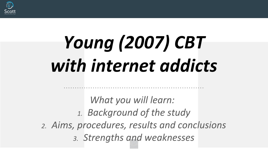 Young (2007) CBT with internet addicts What you will learn: 1. Background of the study 2. Aims, procedures, results and conclusions 3. Strengths and weaknesses