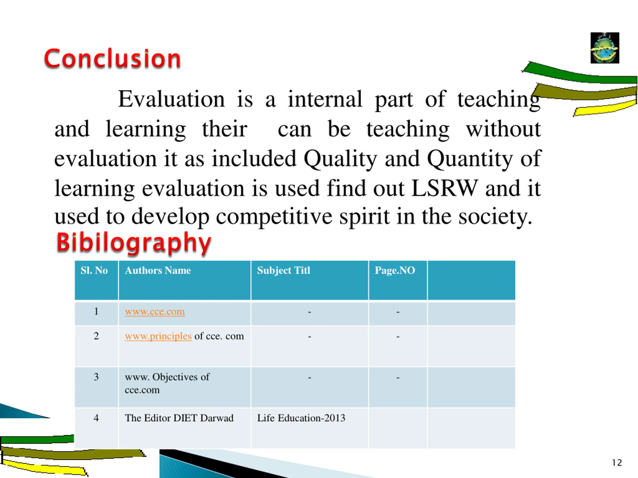 Conclusion Conclusion Evaluation is a internal part of teaching and learning their can be teaching without evaluation it as included Quality and Quantity of learning evaluation is used find out LSRW and it used to develop competitive spirit in the society. Bibilography Sl. No Authors Name Bibilography Subject Titl Page.NO 1 www.cce.com - - 2 www.principles of cce. com - - 3 www. Objectives of cce.com - - 4 The Editor DIET Darwad Life Education-2013 12