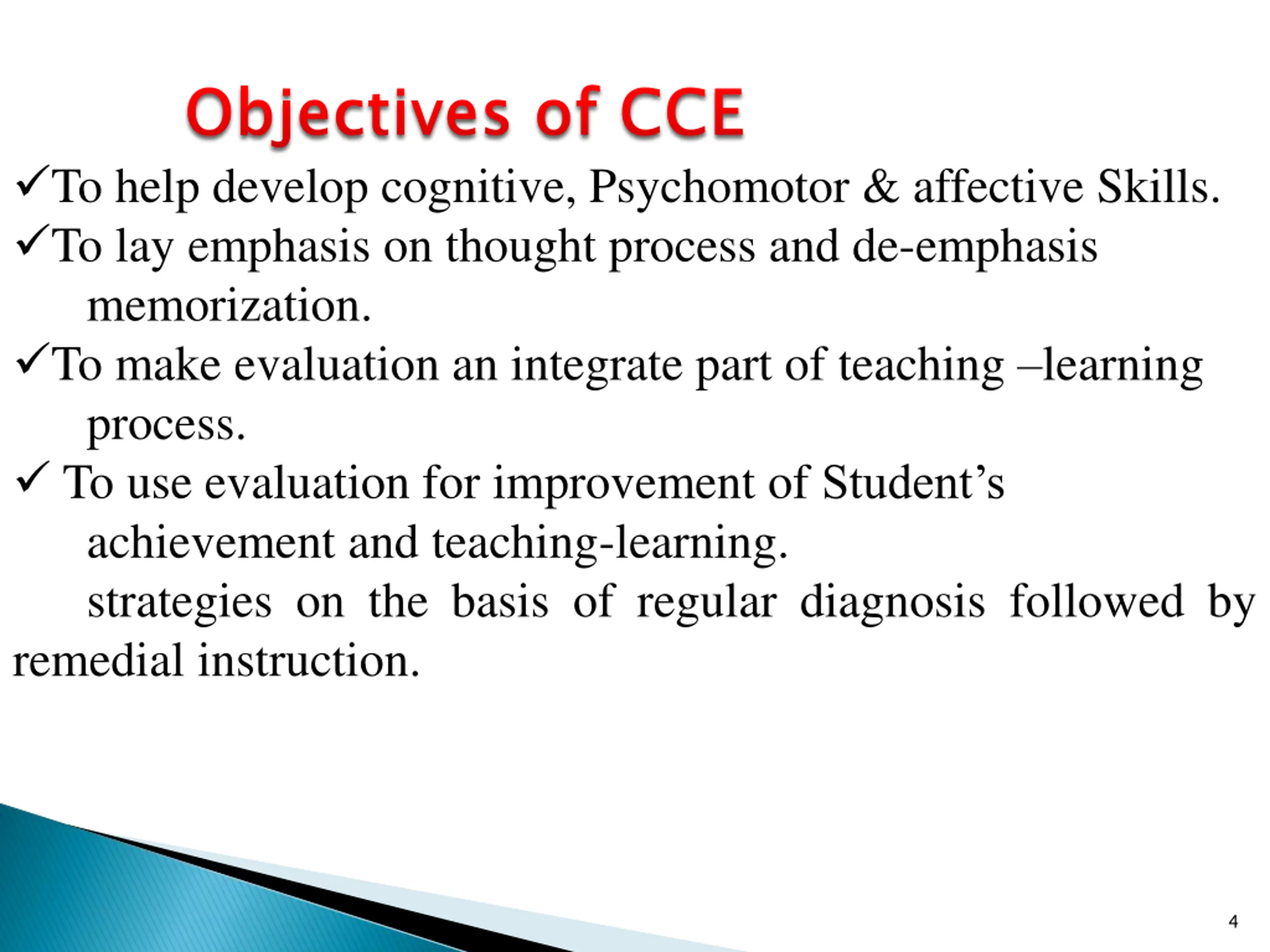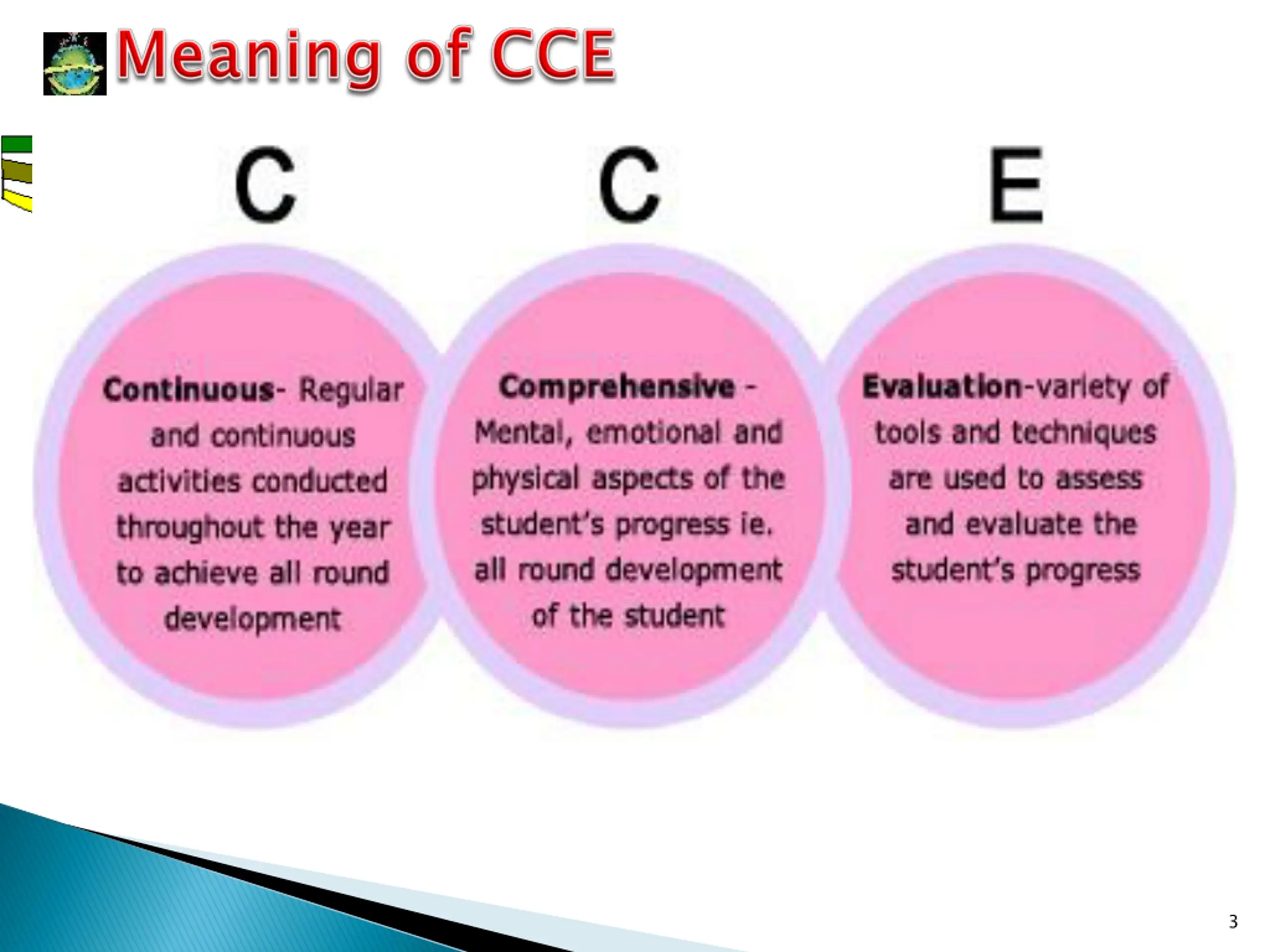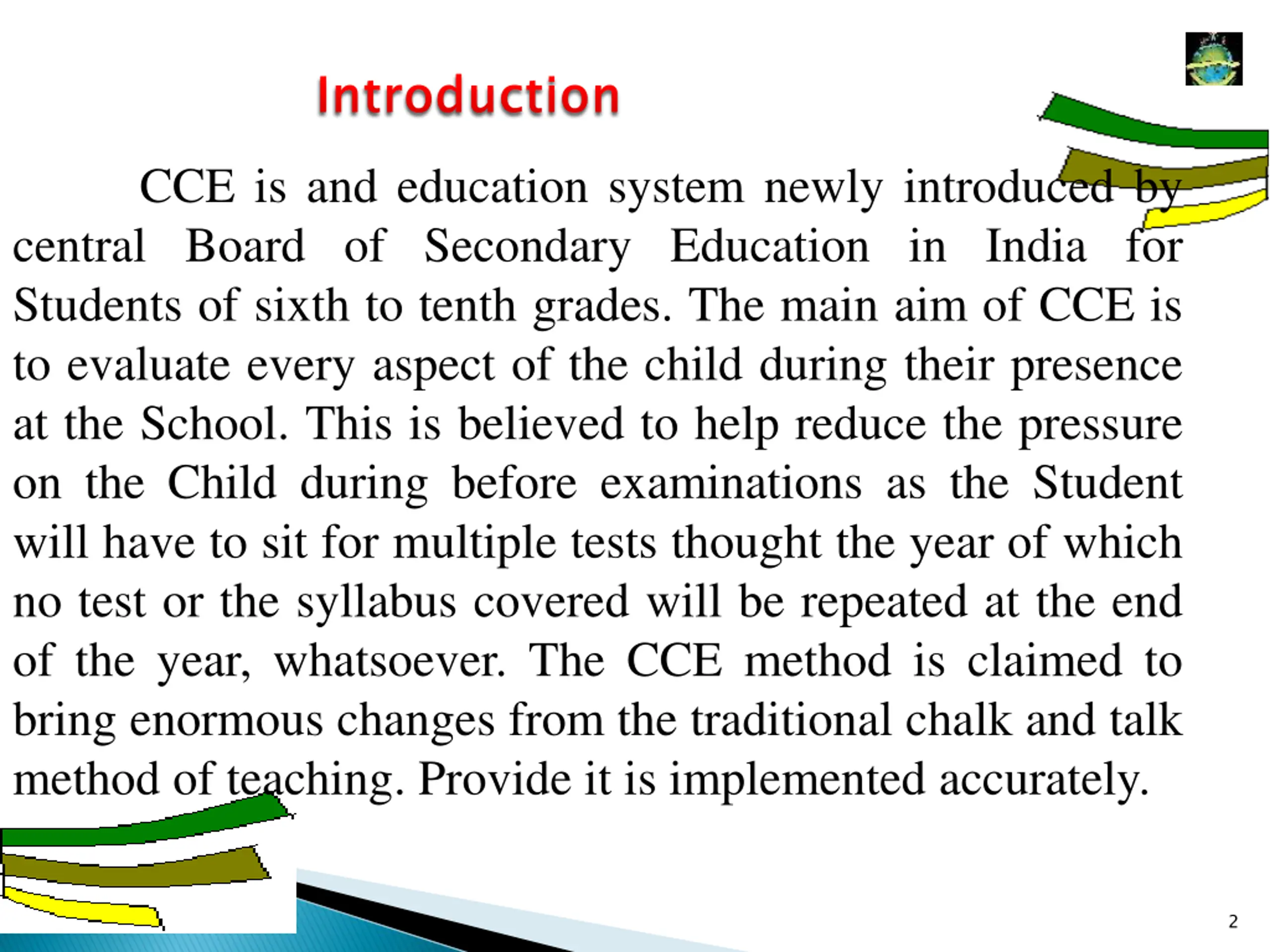 Introduction Introduction CCE is and education system newly introduced by central Board of Secondary Education in India for Students of sixth to tenth grades. The main aim of CCE is to evaluate every aspect of the child during their presence at the School. This is believed to help reduce the pressure on the Child during before examinations as the Student will have to sit for multiple tests thought the year of which no test or the syllabus covered will be repeated at the end of the year, whatsoever. The CCE method is claimed to bring enormous changes from the traditional chalk and talk method of teaching. Provide it is implemented accurately. 2