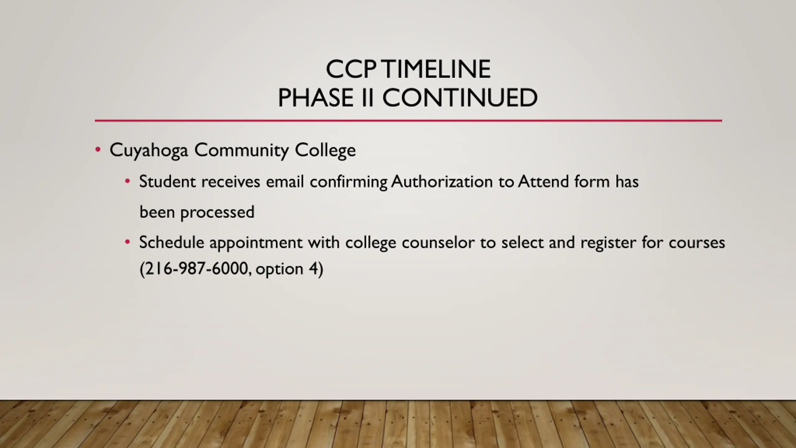 CCP TIMELINE PHASE II CONTINUED Cuyahoga Community College Student receives email confirming Authorization to Attend form has been processed Schedule appointment with college counselor to select and register for courses (216-987-6000, option 4)