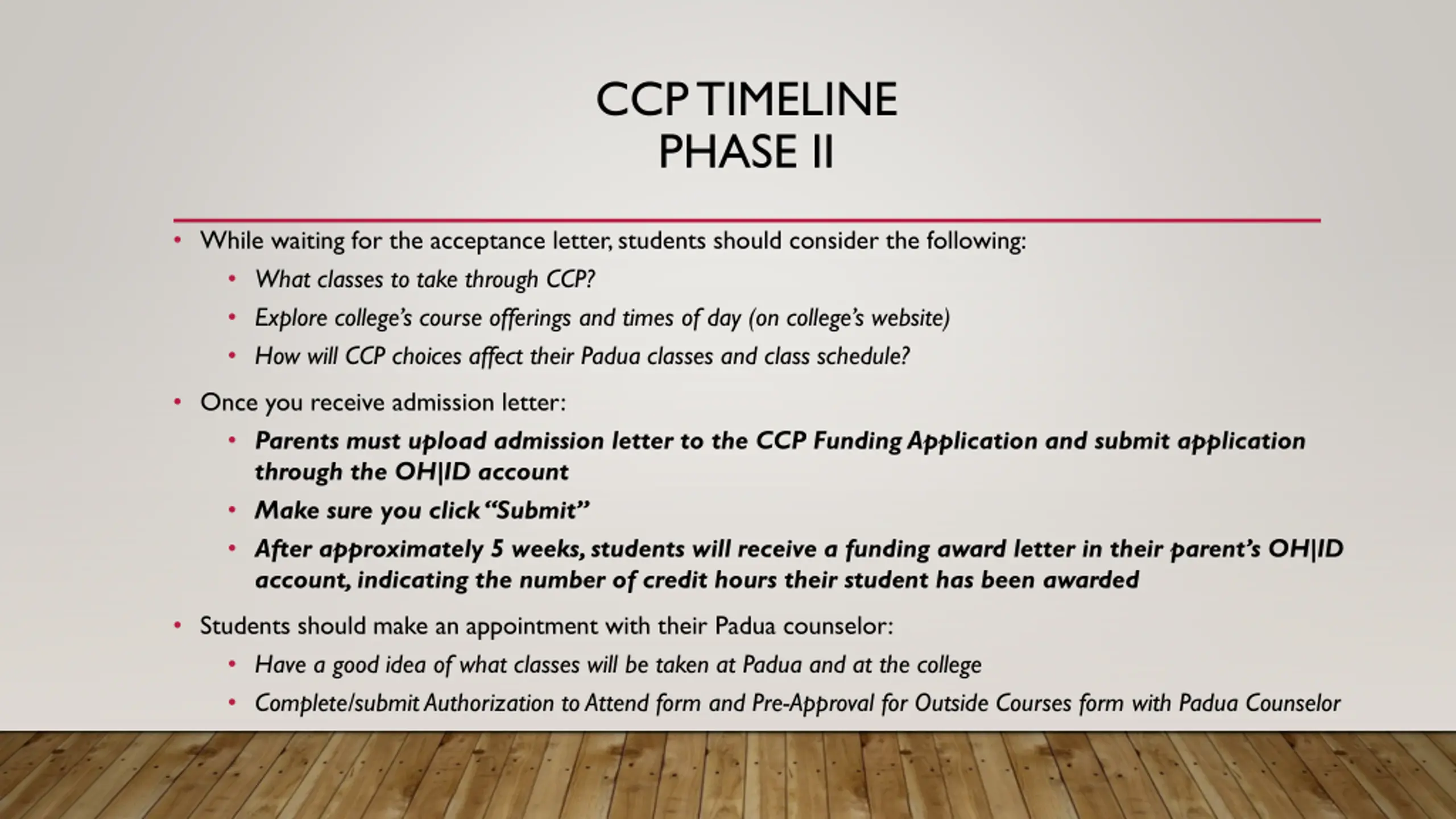 CCP TIMELINE PHASE II While waiting for the acceptance letter, students should consider the following: What classes to take through CCP? Explore college s course offerings and times of day (on college s website) How will CCP choices affect their Padua classes and class schedule? Once you receive admission letter: Parents must upload admission letter to the CCP Funding Application and submit application through the OH|ID account Make sure you click Submit After approximately 5 weeks, students will receive a funding award letter in their parent s OH|ID account, indicating the number of credit hours their student has been awarded Students should make an appointment with their Padua counselor: Have a good idea of what classes will be taken at Padua and at the college Complete/submit Authorization to Attend form and Pre-Approval for Outside Courses form with Padua Counselor