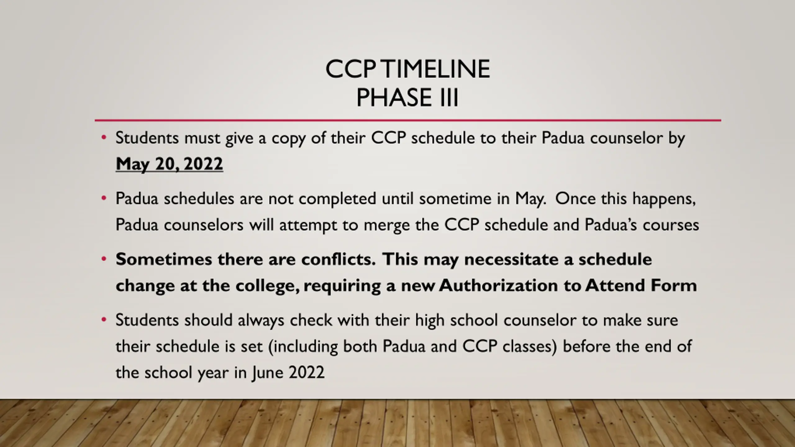 CCP TIMELINE PHASE III Students must give a copy of their CCP schedule to their Padua counselor by May 20, 2022 Padua schedules are not completed until sometime in May. Once this happens, Padua counselors will attempt to merge the CCP schedule and Padua s courses Sometimes there are conflicts. This may necessitate a schedule change at the college, requiring a new Authorization to Attend Form Students should always check with their high school counselor to make sure their schedule is set (including both Padua and CCP classes) before the end of the school year in June 2022
