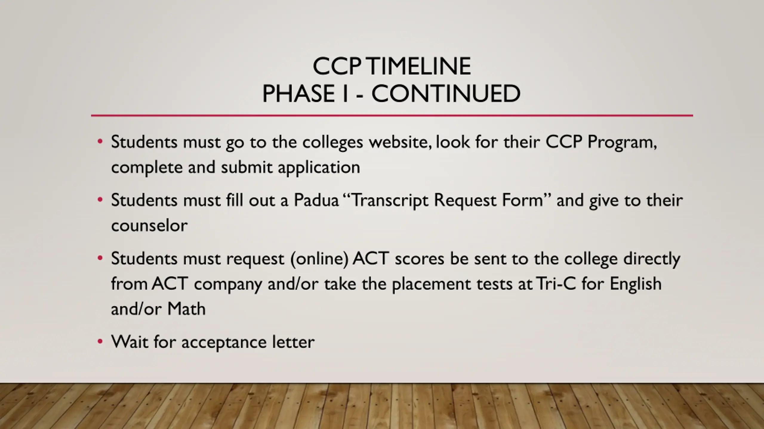 CCPTIMELINE PHASE I - CONTINUED Students must go to the colleges website, look for their CCP Program, complete and submit application Students must fill out a Padua Transcript Request Form and give to their counselor Students must request (online) ACT scores be sent to the college directly from ACT company and/or take the placement tests at Tri-C for English and/or Math Wait for acceptance letter