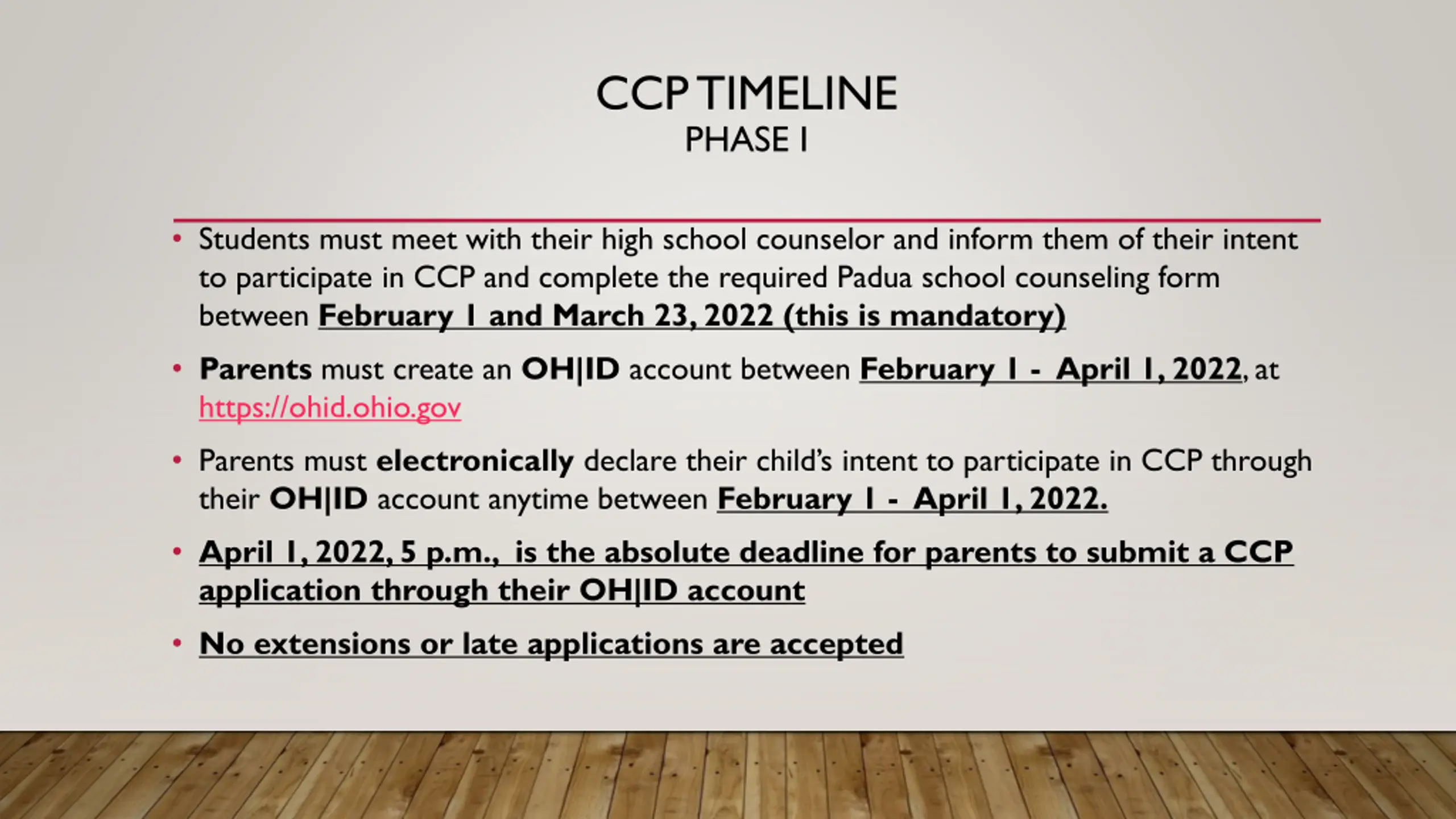 CCPTIMELINE PHASE I Students must meet with their high school counselor and inform them of their intent to participate in CCP and complete the required Padua school counseling form between February 1 and March 23, 2022 (this is mandatory) Parents must create an OH|ID account between February 1 - April 1, 2022, at https://ohid.ohio.gov Parents must electronically declare their child s intent to participate in CCP through their OH|ID account anytime between February 1 - April 1, 2022. April 1, 2022, 5 p.m., is the absolute deadline for parents to submit a CCP application through their OH|ID account No extensions or late applications are accepted