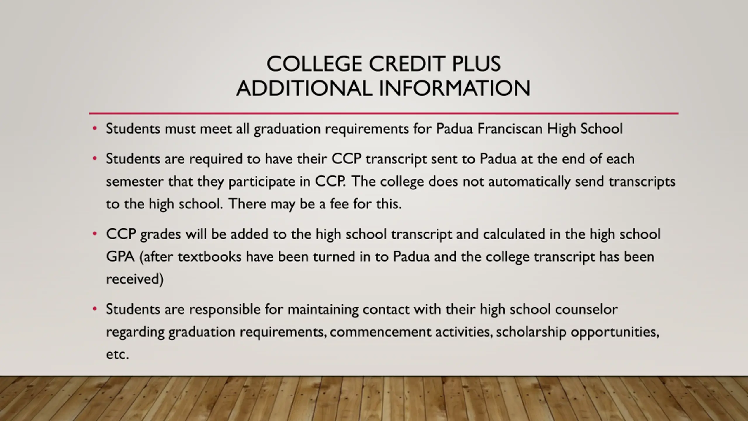 COLLEGE CREDIT PLUS ADDITIONAL INFORMATION Students must meet all graduation requirements for Padua Franciscan High School Students are required to have their CCP transcript sent to Padua at the end of each semester that they participate in CCP. The college does not automatically send transcripts to the high school. There may be a fee for this. CCP grades will be added to the high school transcript and calculated in the high school GPA (after textbooks have been turned in to Padua and the college transcript has been received) Students are responsible for maintaining contact with their high school counselor regarding graduation requirements, commencement activities, scholarship opportunities, etc.