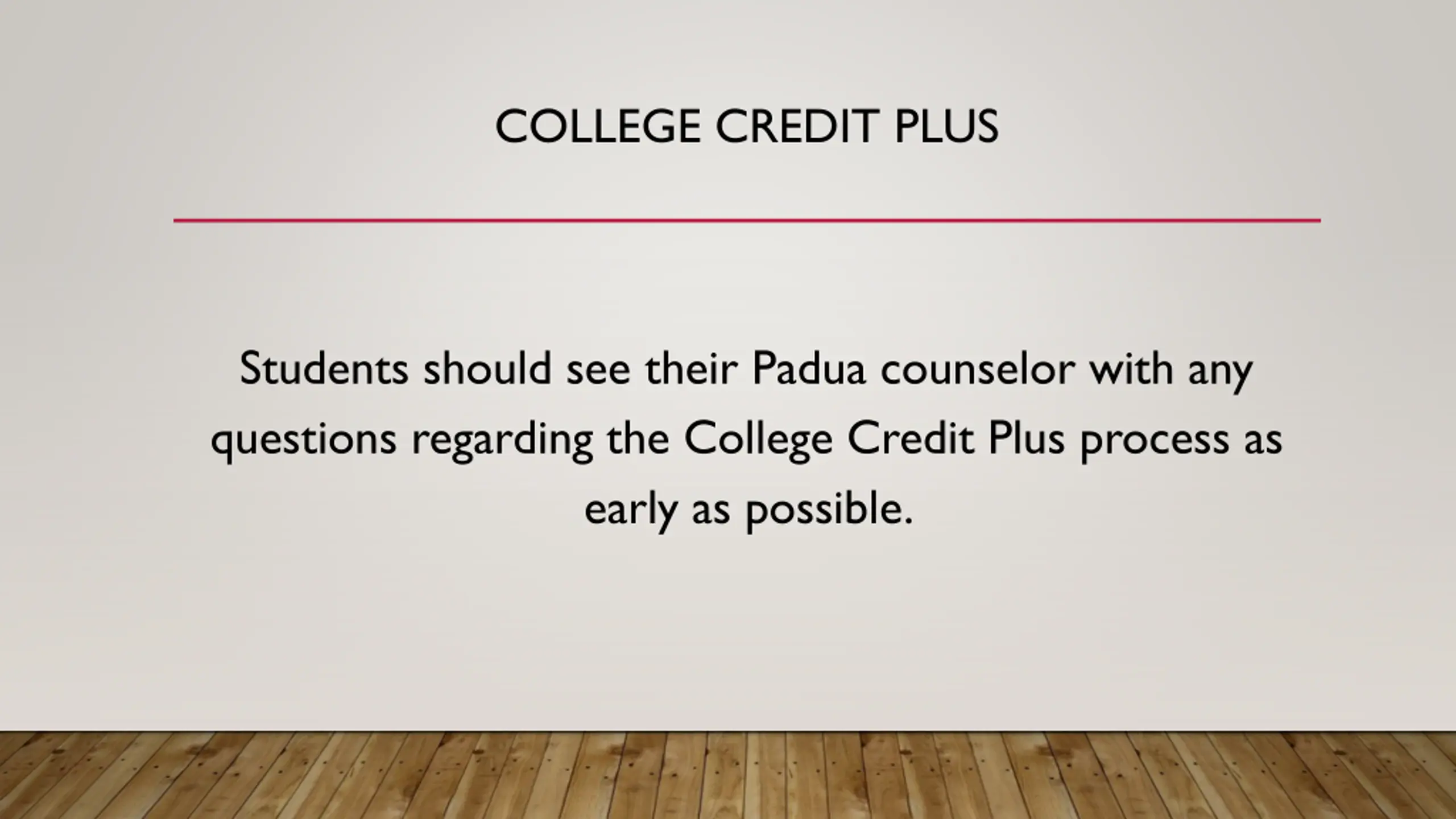 COLLEGE CREDIT PLUS Students should see their Padua counselor with any questions regarding the College Credit Plus process as early as possible.