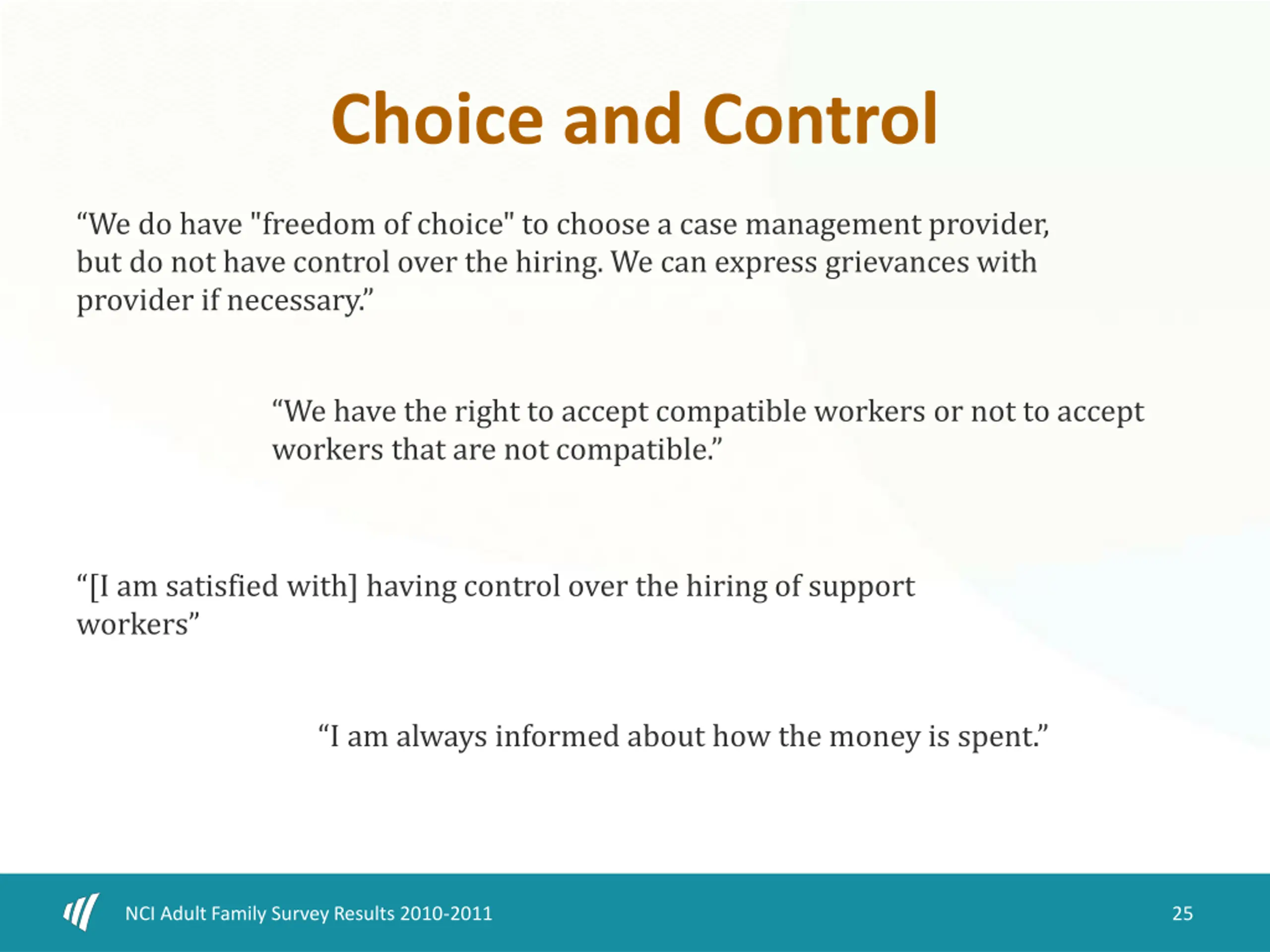 Choice and Control We do have "freedom of choice" to choose a case management provider, but do not have control over the hiring. We can express grievances with provider if necessary. We have the right to accept compatible workers or not to accept workers that are not compatible. [I am satisfied with] having control over the hiring of support workers I am always informed about how the money is spent. NCI Adult Family Survey Results 2010-2011 25