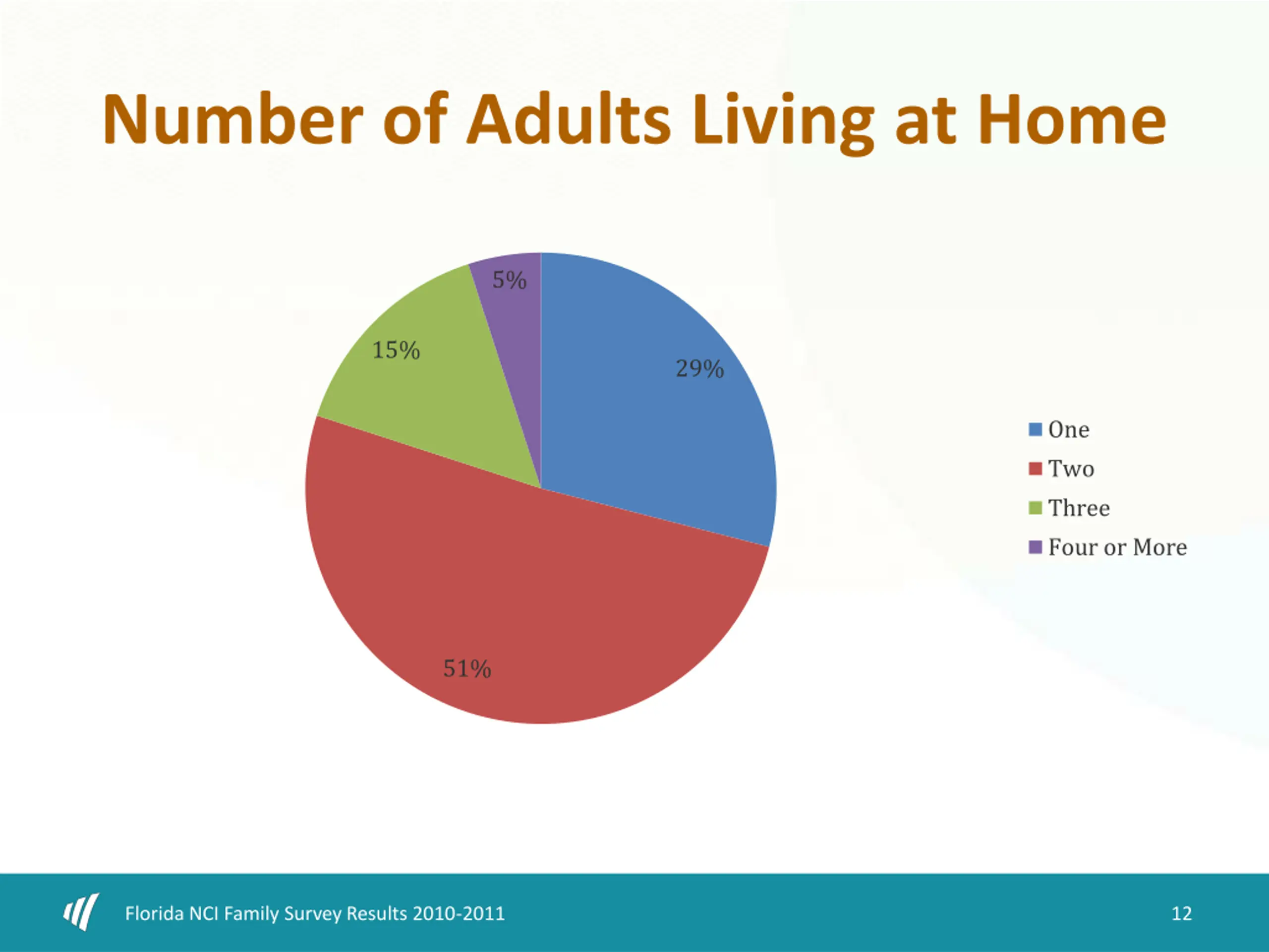 Number of Adults Living at Home 5% 15% 29% One Two Three Four or More 51% Florida NCI Family Survey Results 2010-2011 12