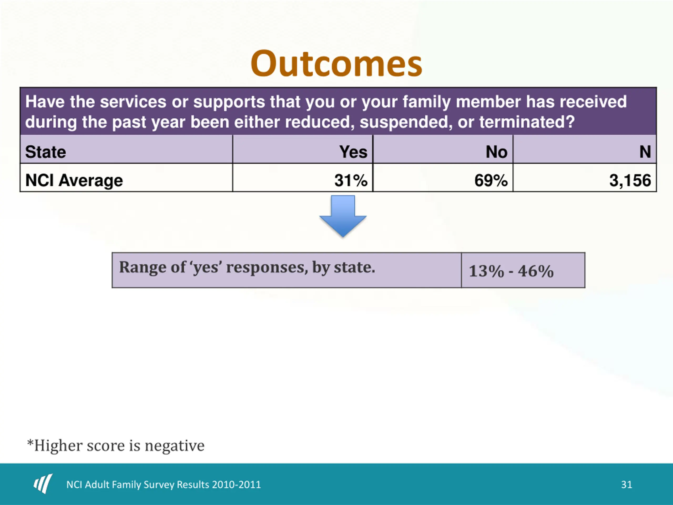 Outcomes Have the services or supports that you or your family member has received during the past year been either reduced, suspended, or terminated? State Yes No N NCI Average 31% 69% 3,156 Range of yes responses, by state. 13% - 46% *Higher score is negative NCI Adult Family Survey Results 2010-2011 31