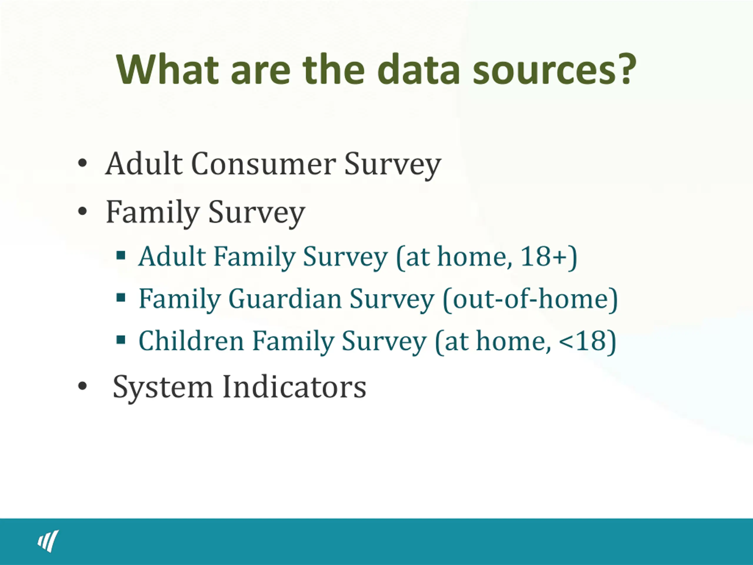 What are the data sources? Adult Consumer Survey Family Survey Adult Family Survey (at home, 18+) Family Guardian Survey (out-of-home) Children Family Survey (at home, <18) System Indicators