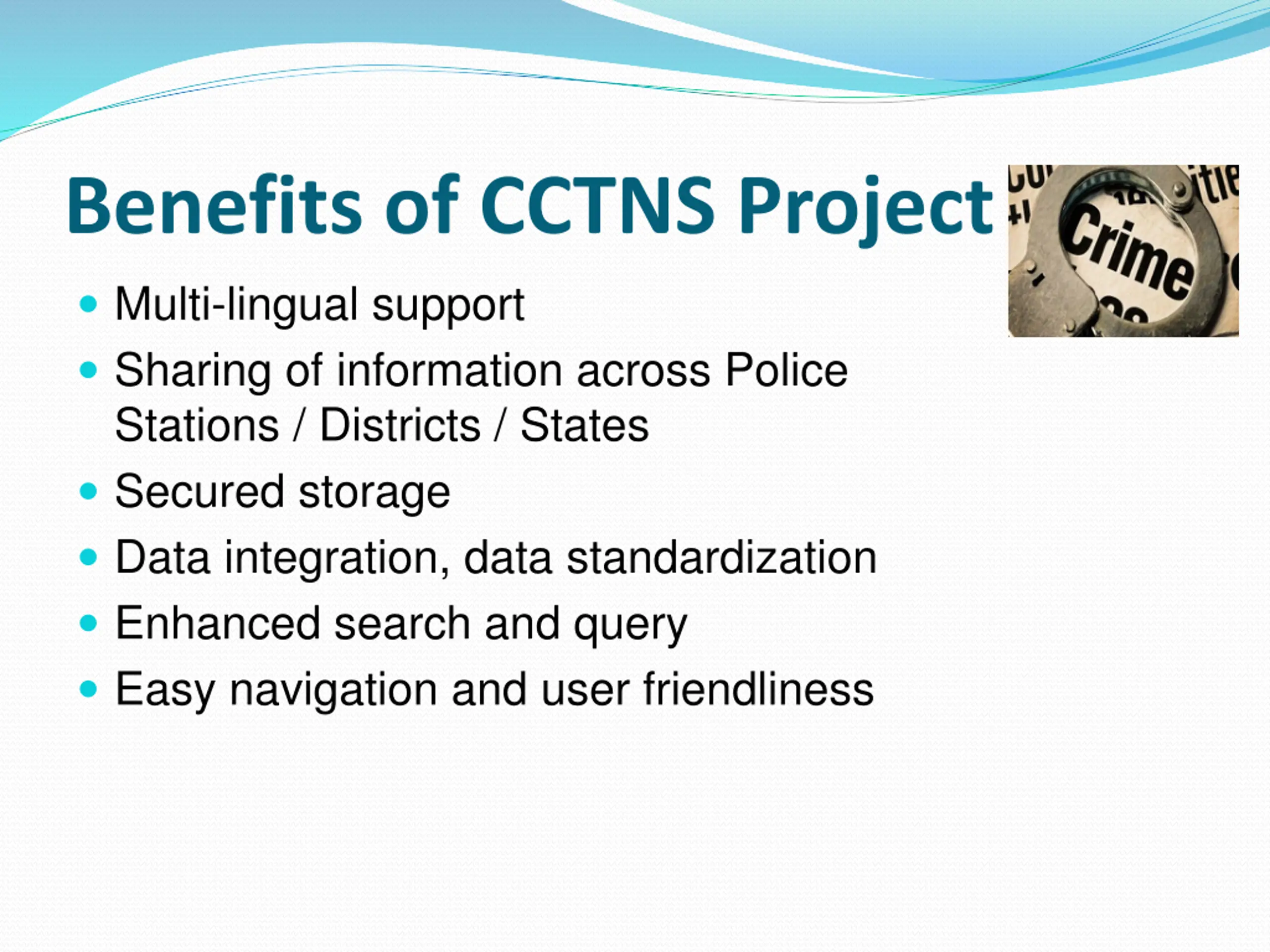 Benefits of CCTNS Project Multi-lingual support Sharing of information across Police Stations / Districts / States Secured storage Data integration, data standardization Enhanced search and query Easy navigation and user friendliness