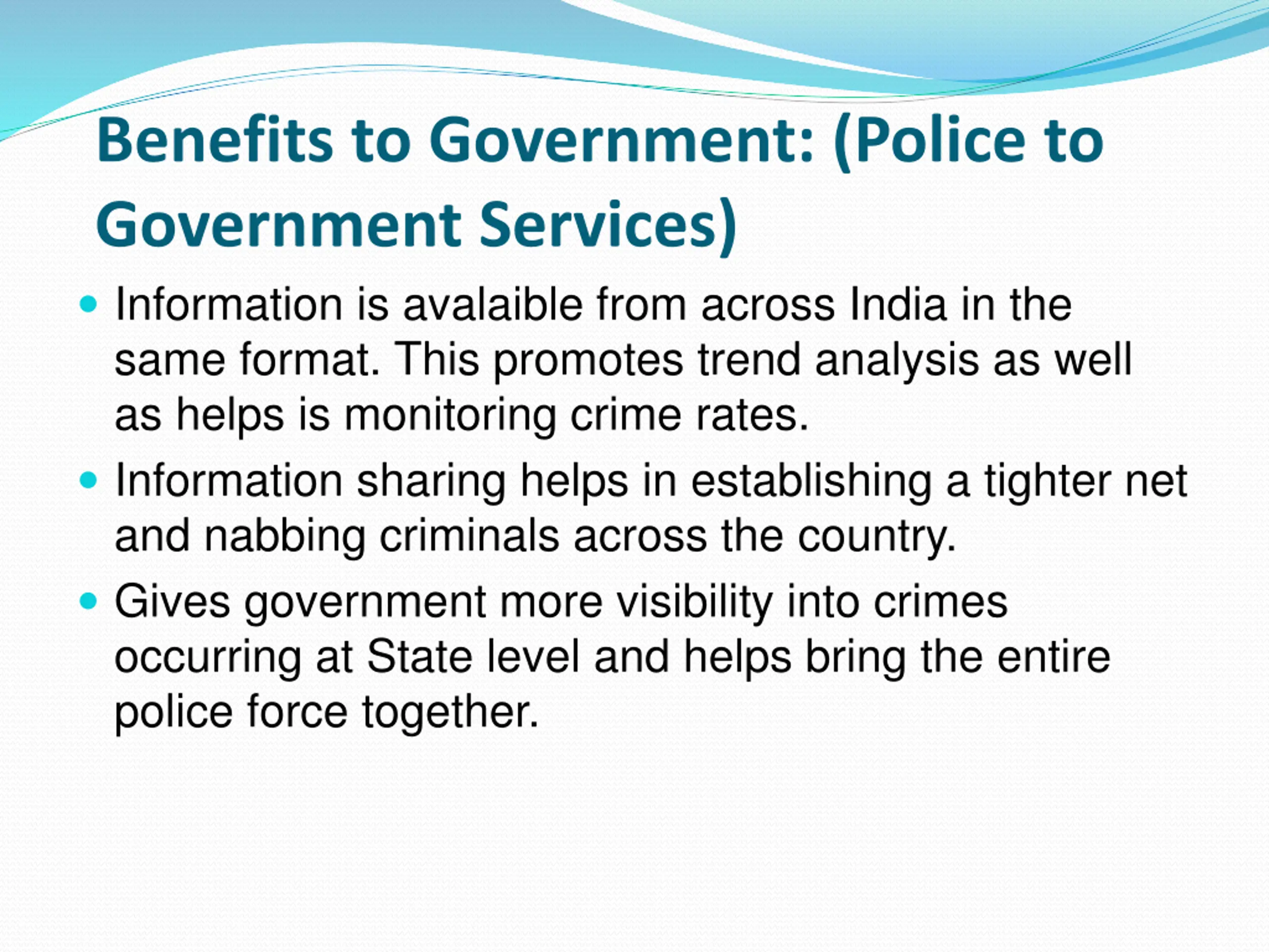 Benefits to Government: (Police to Government Services) Information is avalaible from across India in the same format. This promotes trend analysis as well as helps is monitoring crime rates. Information sharing helps in establishing a tighter net and nabbing criminals across the country. Gives government more visibility into crimes occurring at State level and helps bring the entire police force together.