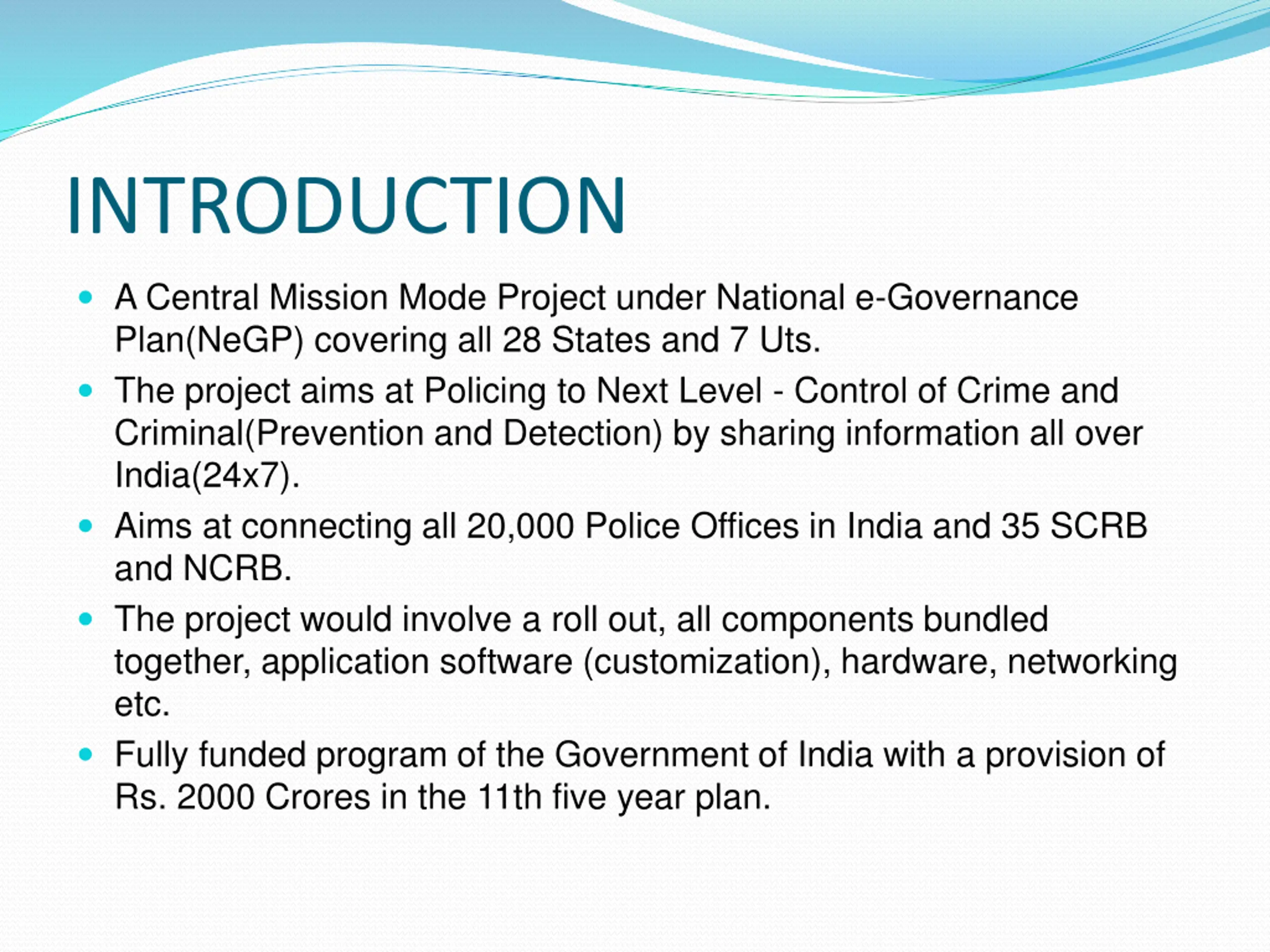 INTRODUCTION A Central Mission Mode Project under National e-Governance Plan(NeGP) covering all 28 States and 7 Uts. The project aims at Policing to Next Level - Control of Crime and Criminal(Prevention and Detection) by sharing information all over India(24x7). Aims at connecting all 20,000 Police Offices in India and 35 SCRB and NCRB. The project would involve a roll out, all components bundled together, application software (customization), hardware, networking etc. Fully funded program of the Government of India with a provision of Rs. 2000 Crores in the 11th five year plan.