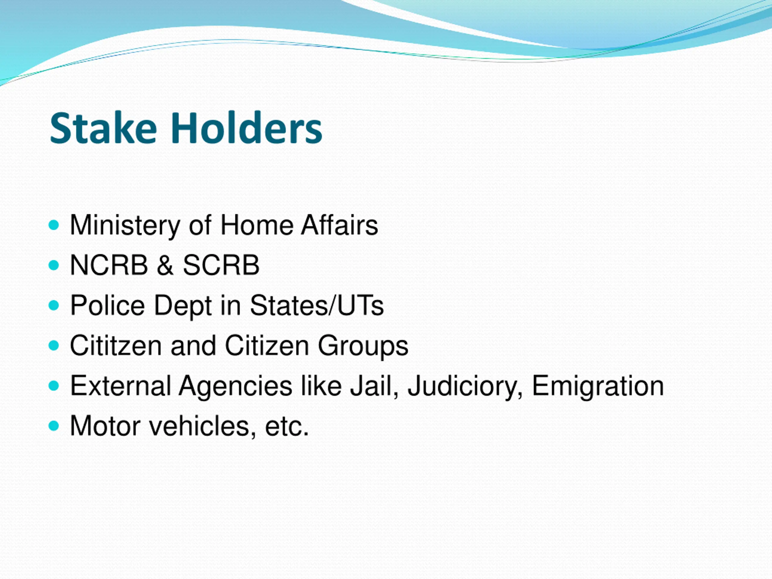 Stake Holders Ministery of Home Affairs NCRB & SCRB Police Dept in States/UTs Cititzen and Citizen Groups External Agencies like Jail, Judiciory, Emigration Motor vehicles, etc.