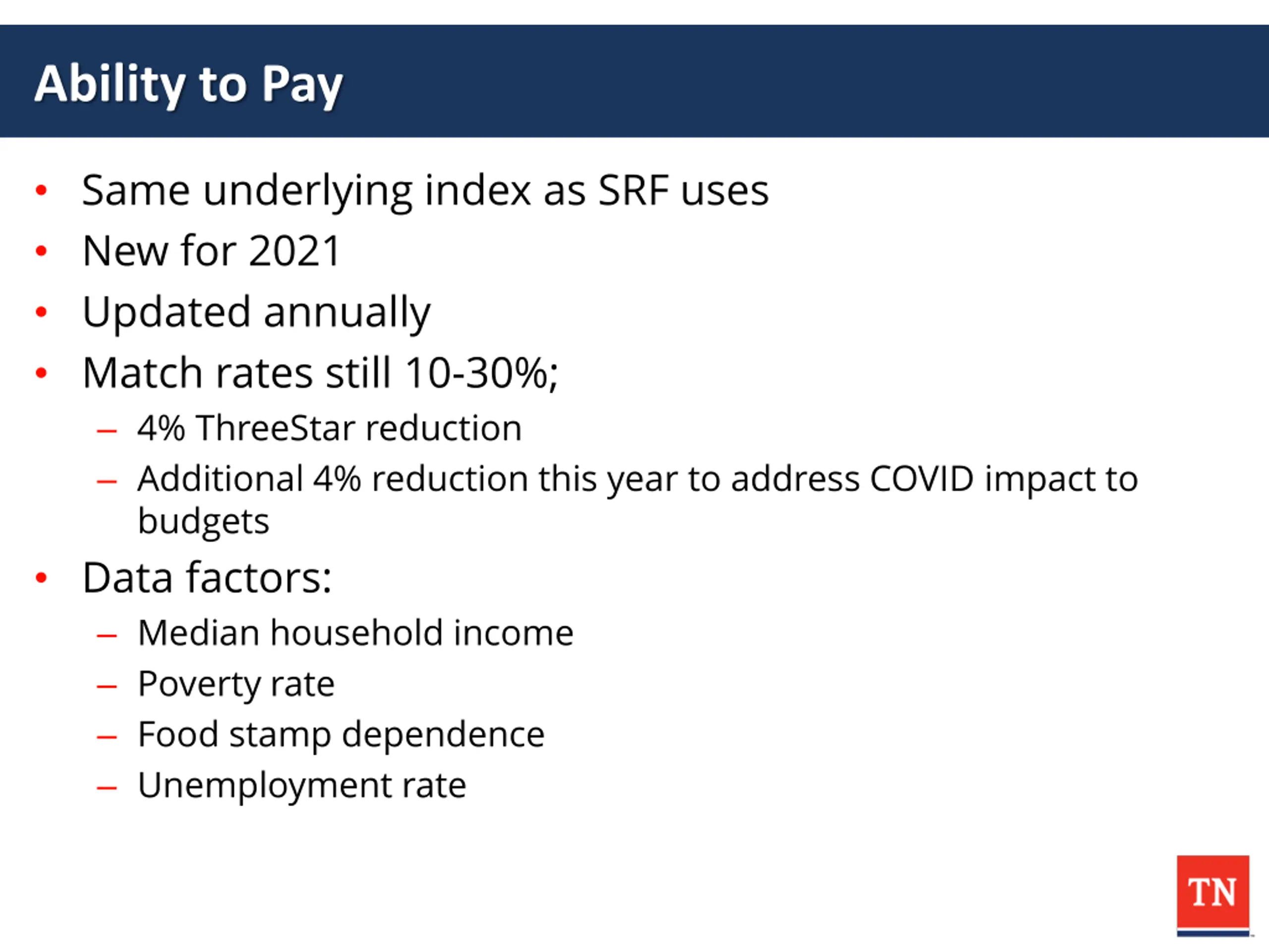 Ability to Pay Same underlying index as SRF uses New for 2021 Updated annually Match rates still 10-30%; 4% ThreeStar reduction Additional 4% reduction this year to address COVID impact to budgets Data factors: Median household income Poverty rate Food stamp dependence Unemployment rate