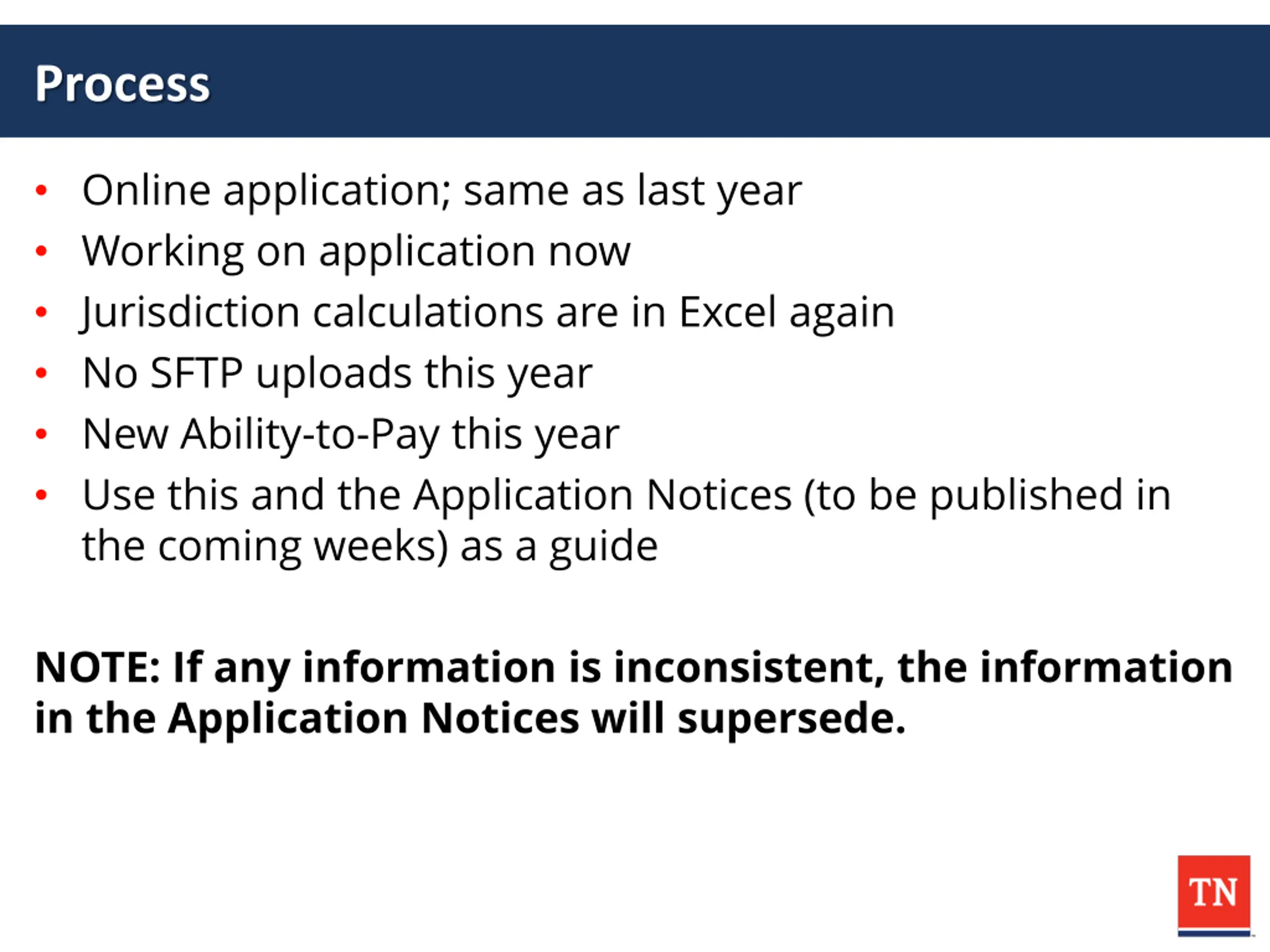 Process Online application; same as last year Working on application now Jurisdiction calculations are in Excel again No SFTP uploads this year New Ability-to-Pay this year Use this and the Application Notices (to be published in the coming weeks) as a guide NOTE: If any information is inconsistent, the information in the Application Notices will supersede.