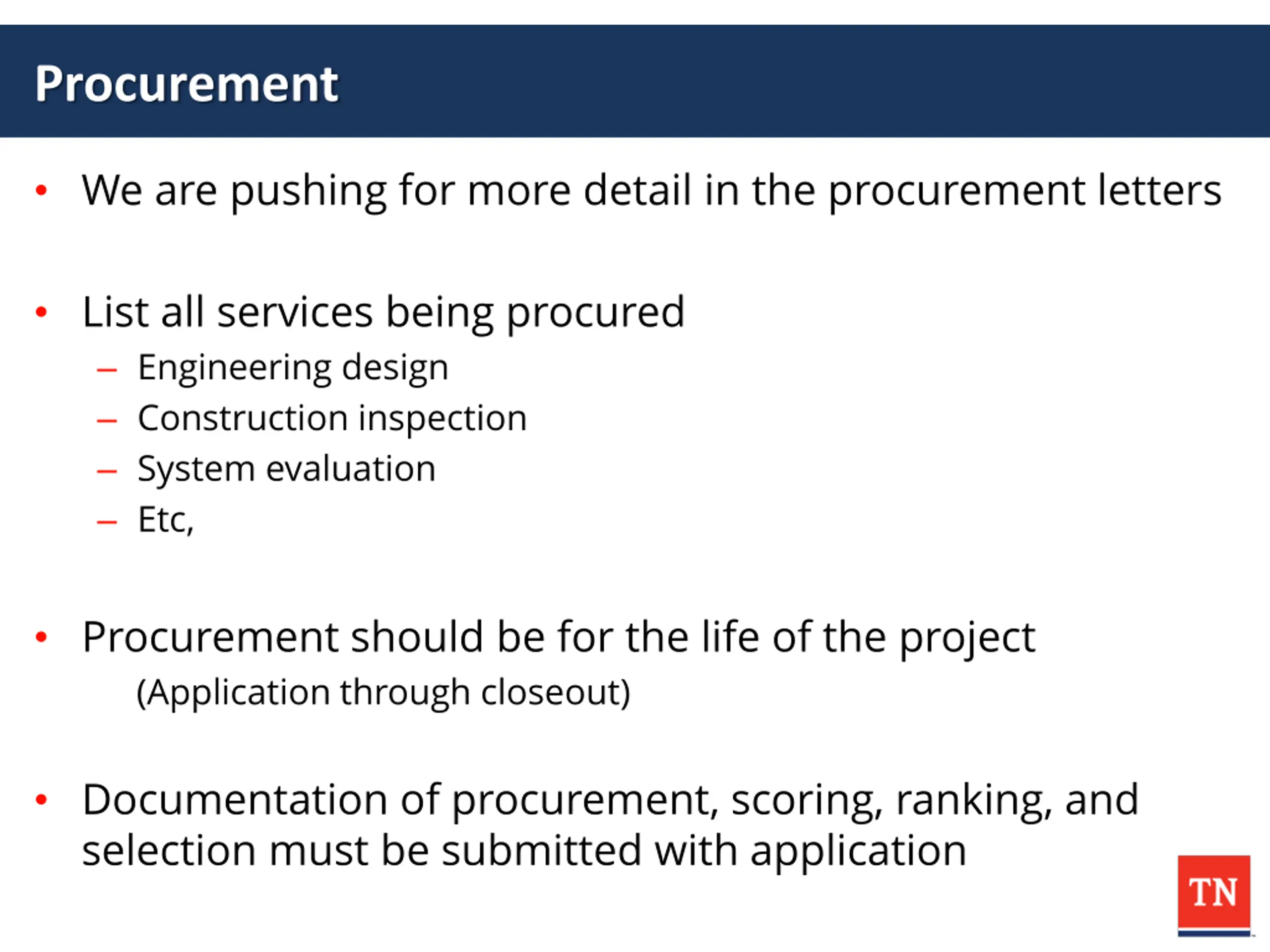 Procurement We are pushing for more detail in the procurement letters List all services being procured Engineering design Construction inspection System evaluation Etc, Procurement should be for the life of the project (Application through closeout) Documentation of procurement, scoring, ranking, and selection must be submitted with application