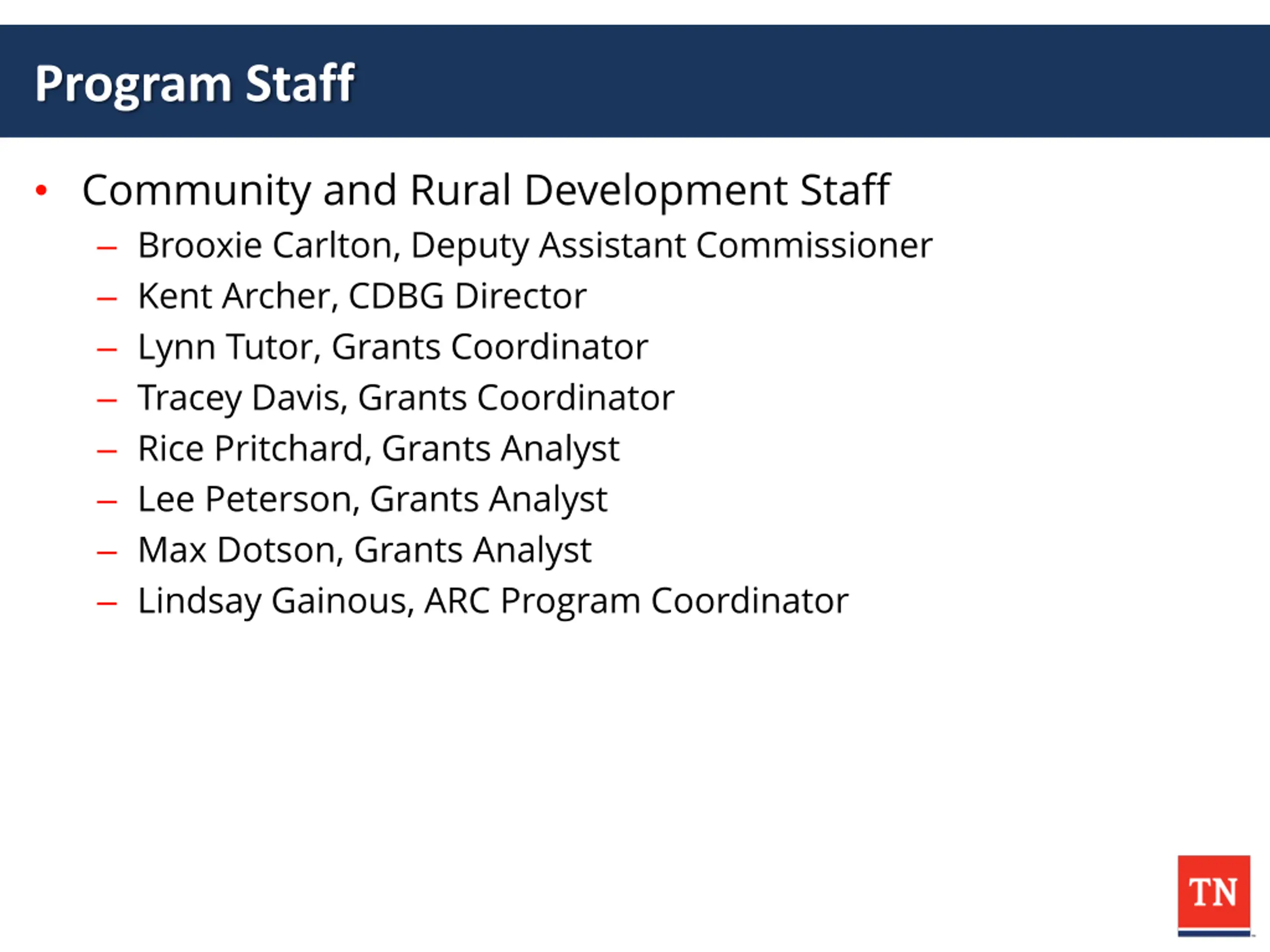 Program Staff Community and Rural Development Staff Brooxie Carlton, Deputy Assistant Commissioner Kent Archer, CDBG Director Lynn Tutor, Grants Coordinator Tracey Davis, Grants Coordinator Rice Pritchard, Grants Analyst Lee Peterson, Grants Analyst Max Dotson, Grants Analyst Lindsay Gainous, ARC Program Coordinator