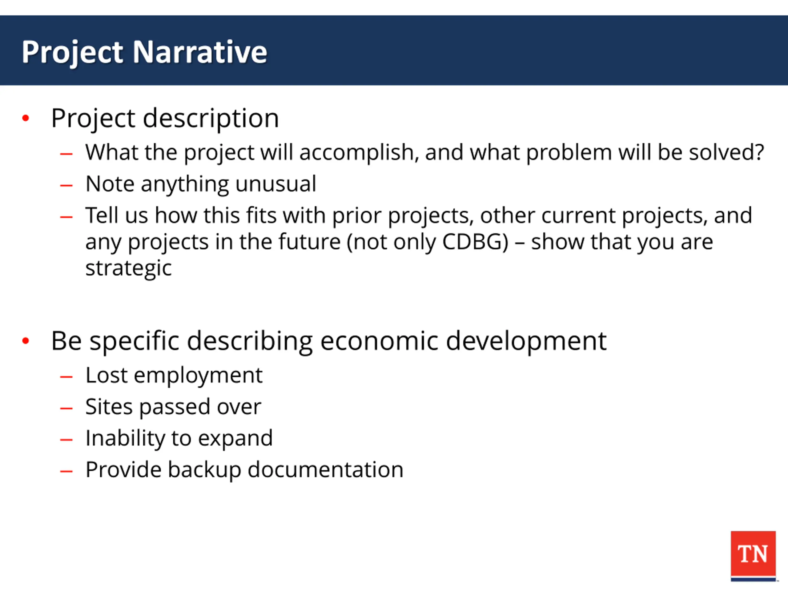 Project Narrative Project description What the project will accomplish, and what problem will be solved? Note anything unusual Tell us how this fits with prior projects, other current projects, and any projects in the future (not only CDBG) show that you are strategic Be specific describing economic development Lost employment Sites passed over Inability to expand Provide backup documentation