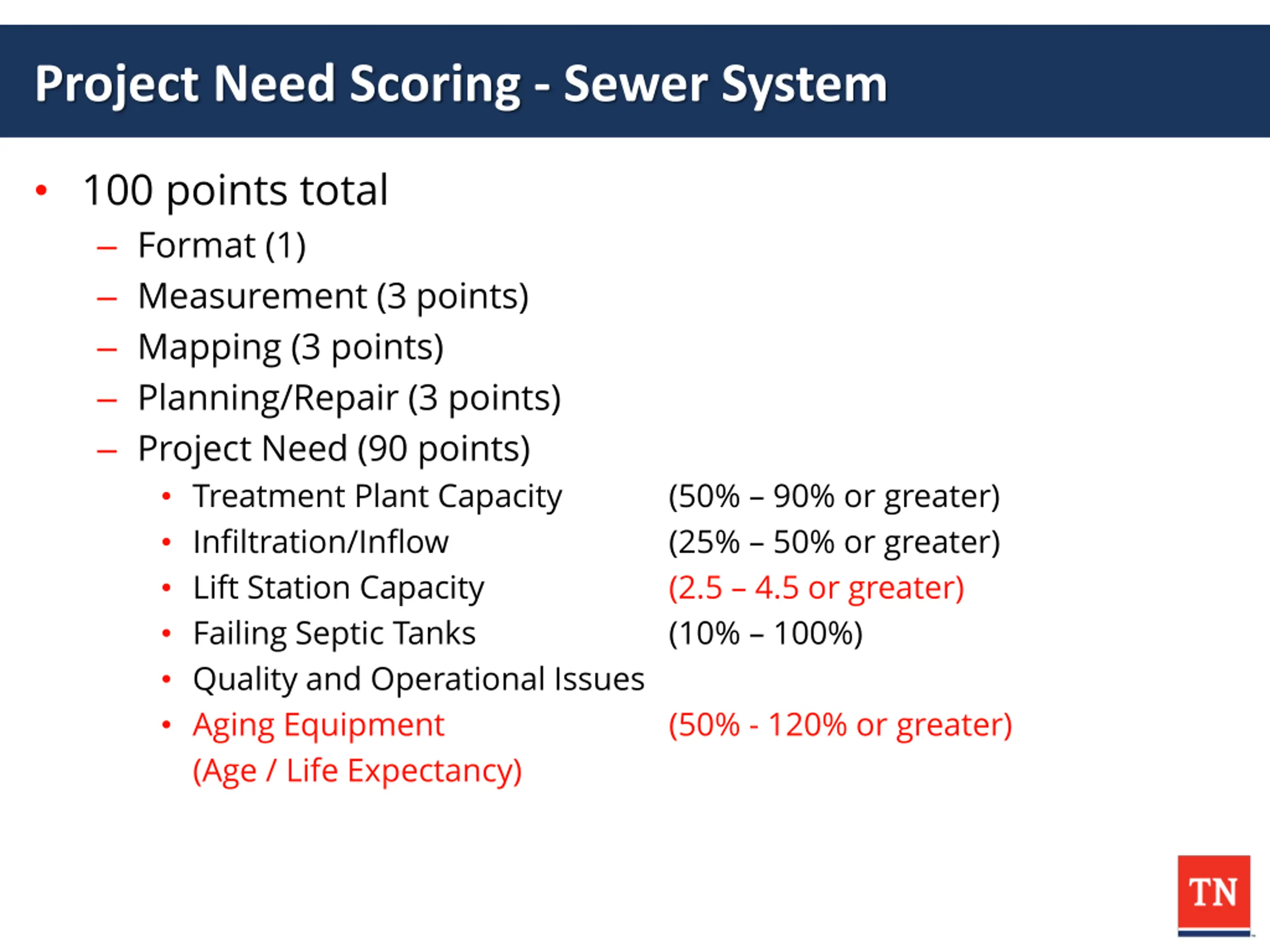 Project Need Scoring - Sewer System 100 points total Format (1) Measurement (3 points) Mapping (3 points) Planning/Repair (3 points) Project Need (90 points) Treatment Plant Capacity Infiltration/Inflow Lift Station Capacity Failing Septic Tanks Quality and Operational Issues Aging Equipment (Age / Life Expectancy) (50% 90% or greater) (25% 50% or greater) (2.5 4.5 or greater) (10% 100%) (50% - 120% or greater)