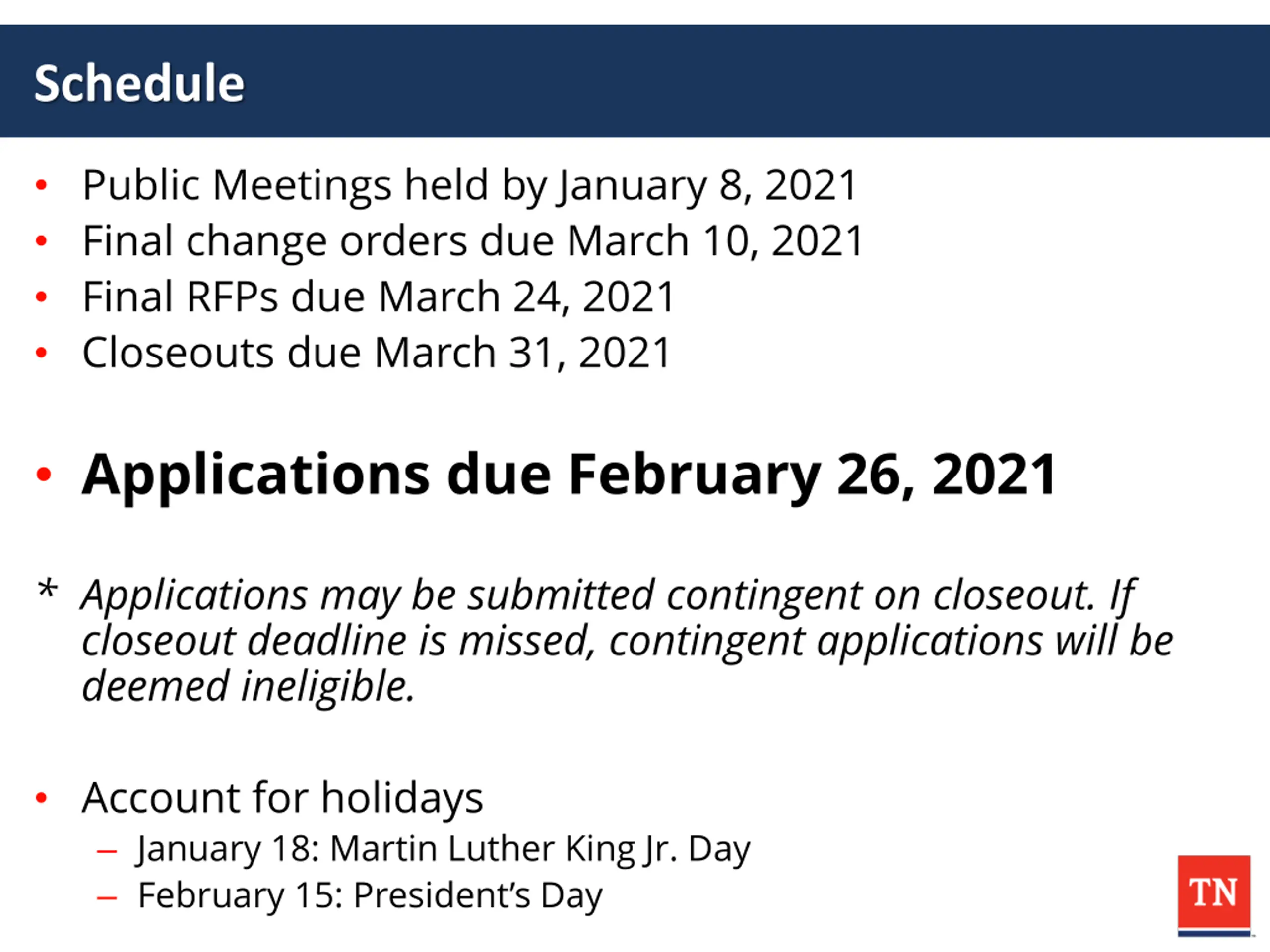 Schedule Public Meetings held by January 8, 2021 Final change orders due March 10, 2021 Final RFPs due March 24, 2021 Closeouts due March 31, 2021 Applications due February 26, 2021 * Applications may be submitted contingent on closeout. If closeout deadline is missed, contingent applications will be deemed ineligible. Account for holidays January 18: Martin Luther King Jr. Day February 15: President s Day