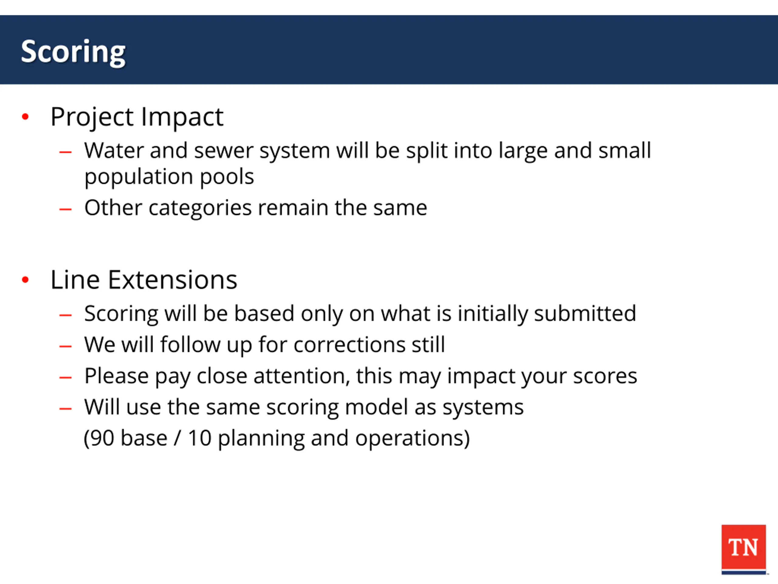 Scoring Project Impact Water and sewer system will be split into large and small population pools Other categories remain the same Line Extensions Scoring will be based only on what is initially submitted We will follow up for corrections still Please pay close attention, this may impact your scores Will use the same scoring model as systems (90 base / 10 planning and operations)
