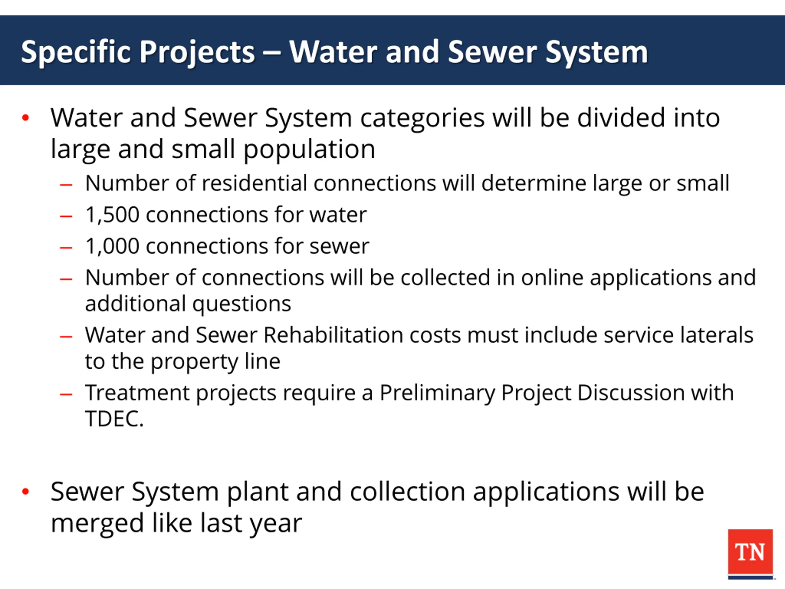 Specific Projects Water and Sewer System Water and Sewer System categories will be divided into large and small population Number of residential connections will determine large or small 1,500 connections for water 1,000 connections for sewer Number of connections will be collected in online applications and additional questions Water and Sewer Rehabilitation costs must include service laterals to the property line Treatment projects require a Preliminary Project Discussion with TDEC. Sewer System plant and collection applications will be merged like last year