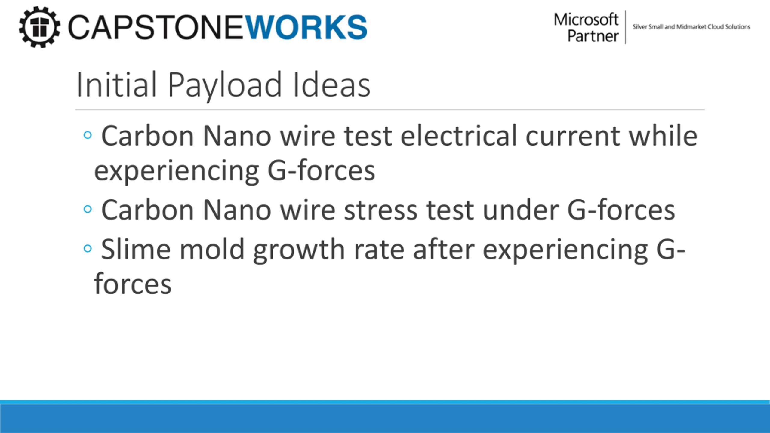 Initial Payload Ideas Carbon Nano wire test electrical current while experiencing G-forces Carbon Nano wire stress test under G-forces Slime mold growth rate after experiencing G- forces