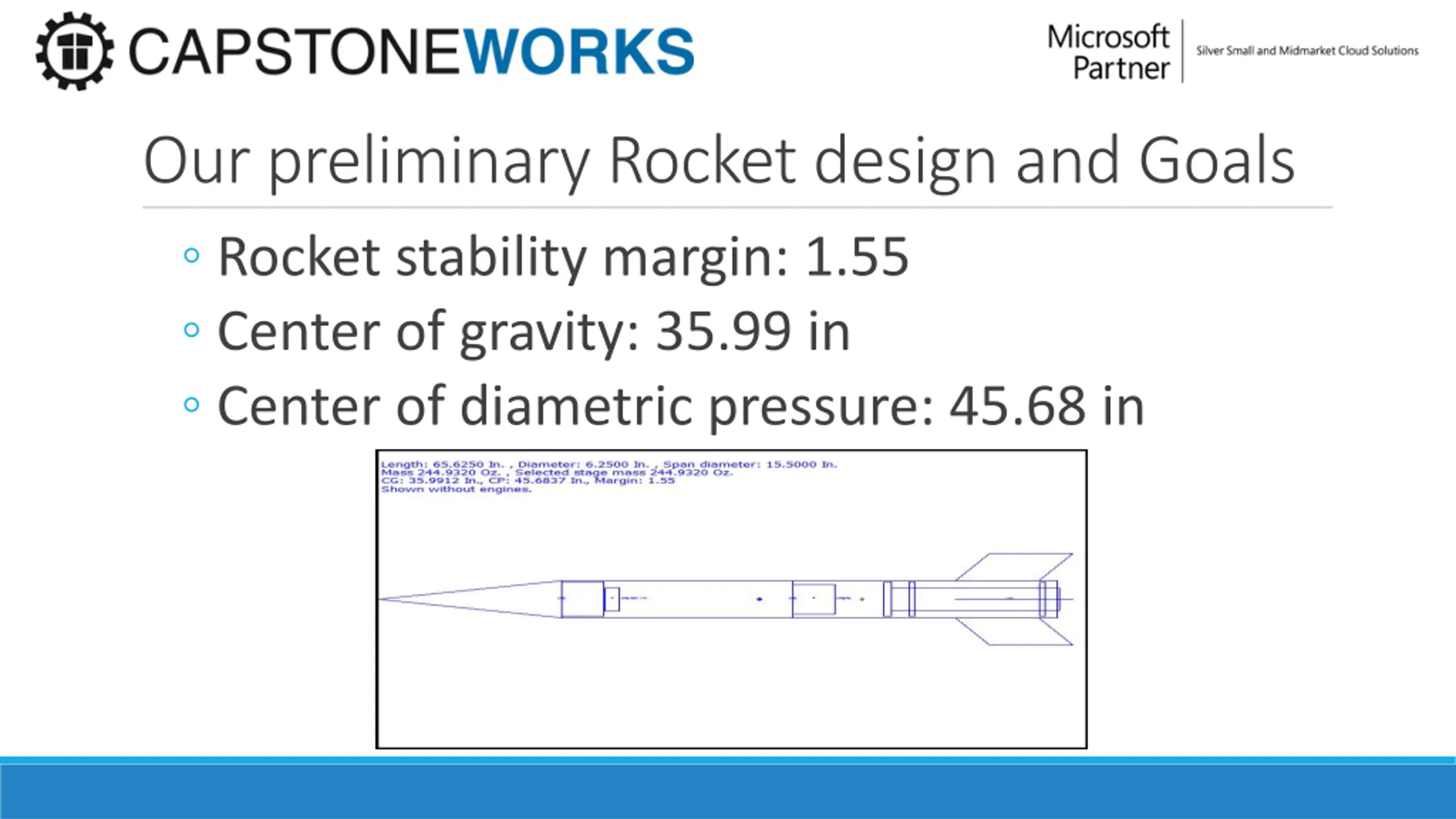 Our preliminary Rocket design and Goals Rocket stability margin: 1.55 Center of gravity: 35.99 in Center of diametric pressure: 45.68 in