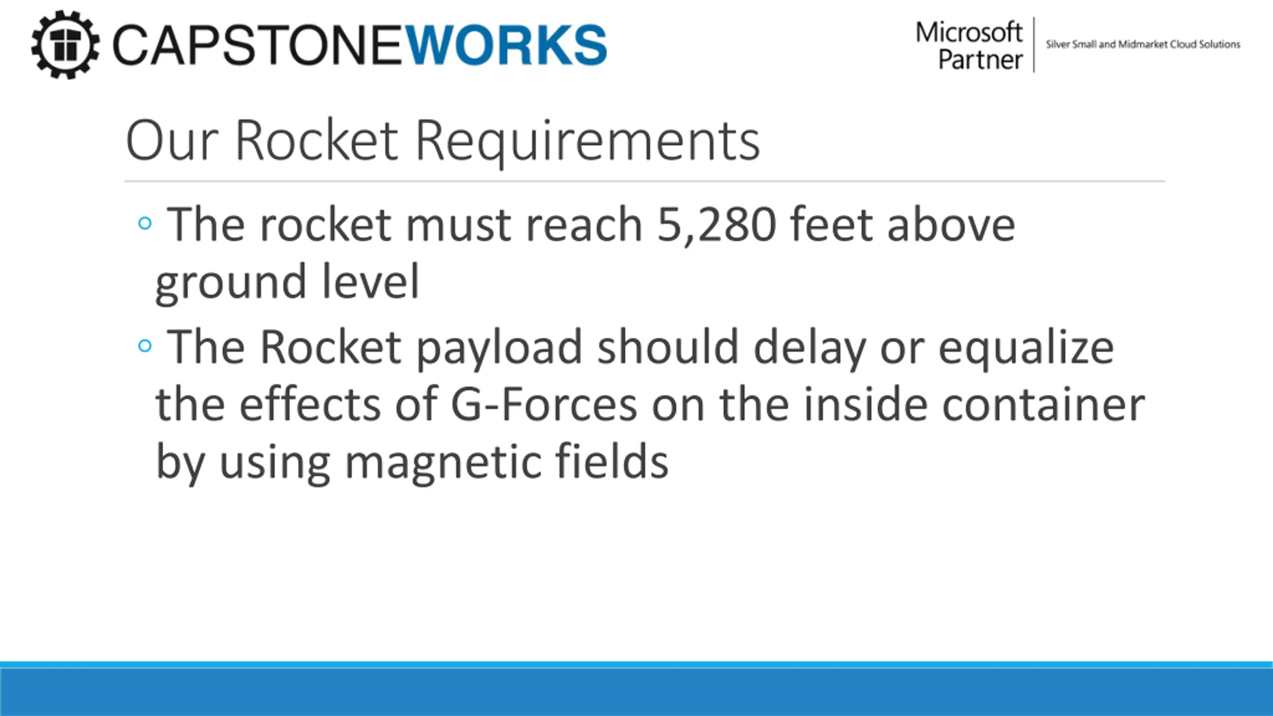 Our Rocket Requirements The rocket must reach 5,280 feet above ground level The Rocket payload should delay or equalize the effects of G-Forces on the inside container by using magnetic fields
