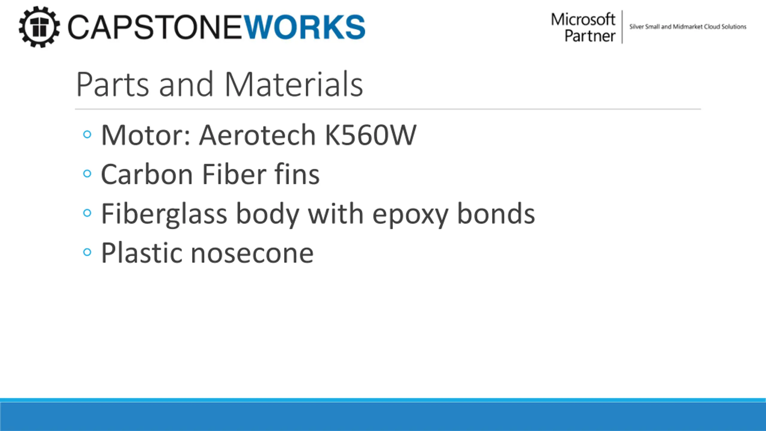 Parts and Materials Motor: Aerotech K560W Carbon Fiber fins Fiberglass body with epoxy bonds Plastic nosecone