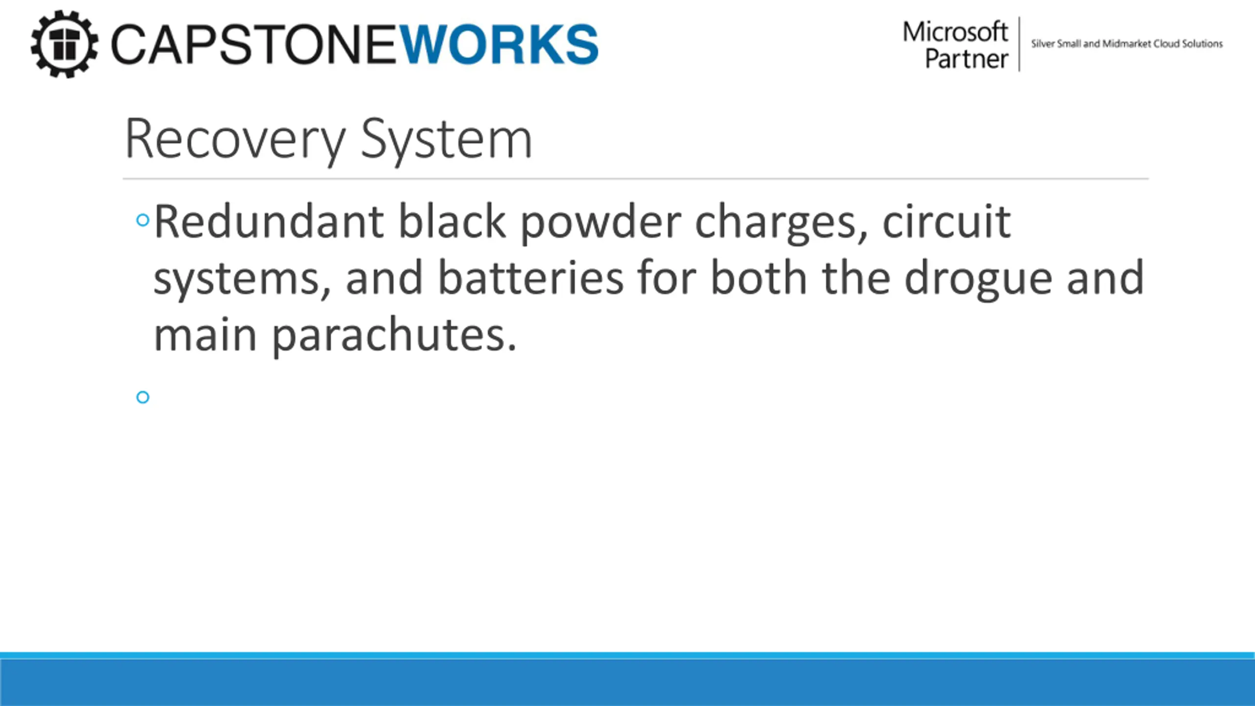 Recovery System Redundant black powder charges, circuit systems, and batteries for both the drogue and main parachutes.