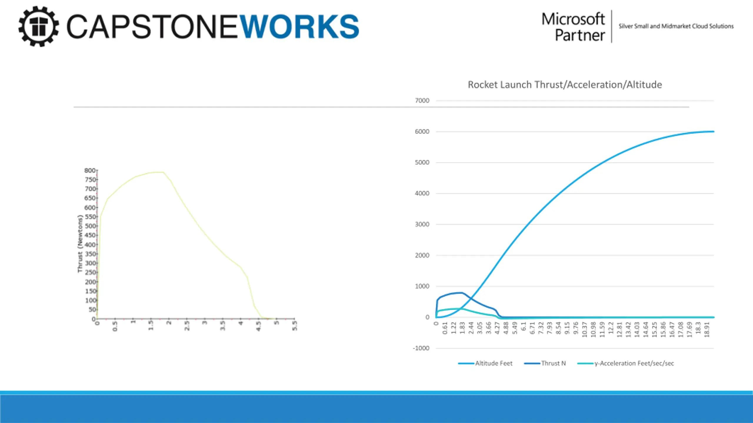 Rocket Launch Thrust/Acceleration/Altitude 7000 6000 5000 4000 3000 2000 1000 0 0.61 1.22 1.83 2.44 3.05 3.66 4.27 4.88 5.49 6.71 7.32 7.93 8.54 9.15 9.76 10.37 10.98 11.59 12.2 12.81 13.42 14.03 14.64 15.25 15.86 16.47 17.08 17.69 18.3 18.91 6.1 0 -1000 Altitude Feet Thrust N y-Acceleration Feet/sec/sec