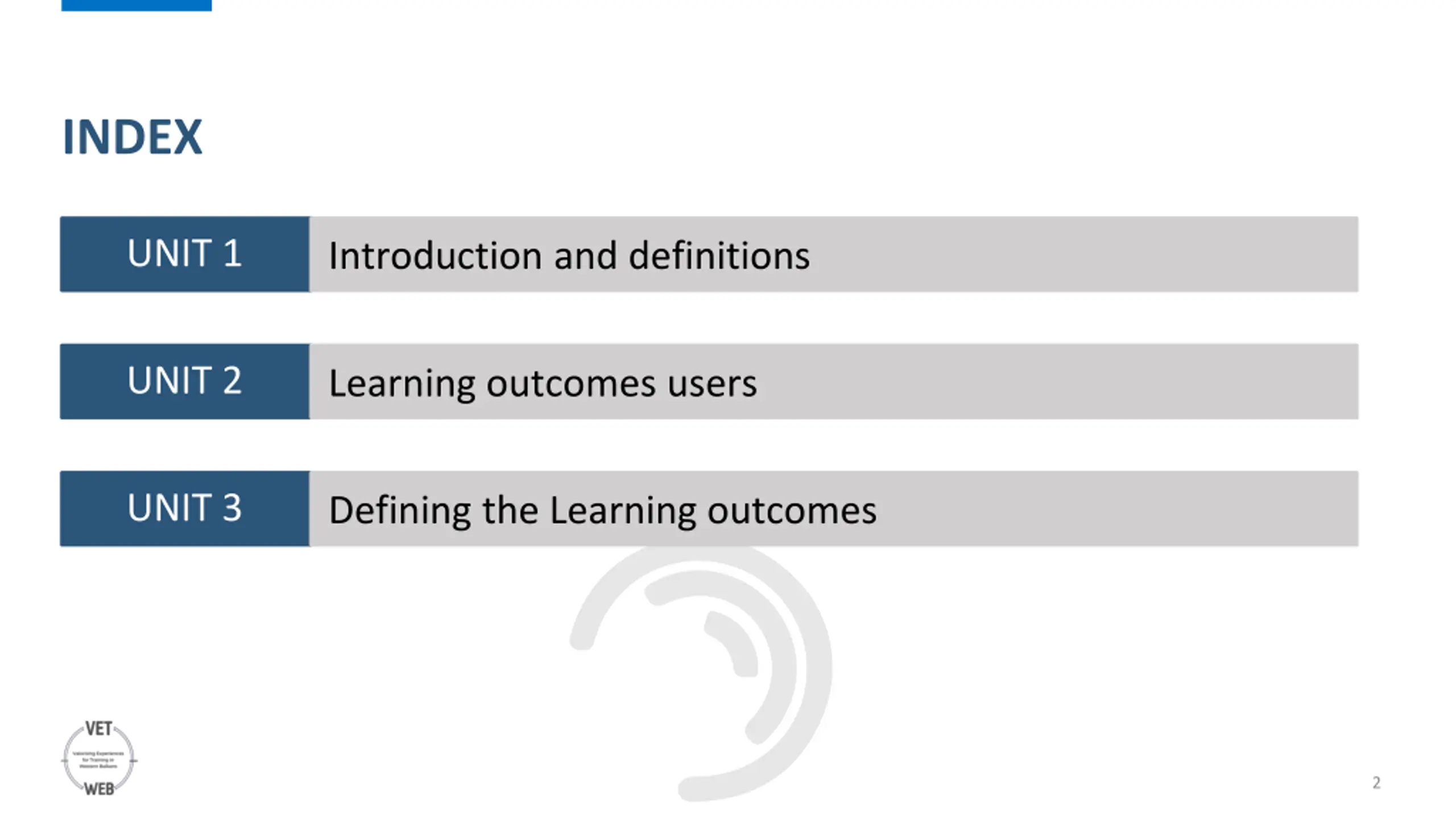 INDEX UNIT 1 Introduction and definitions UNIT 2 Learning outcomes users UNIT 3 Defining the Learning outcomes 2