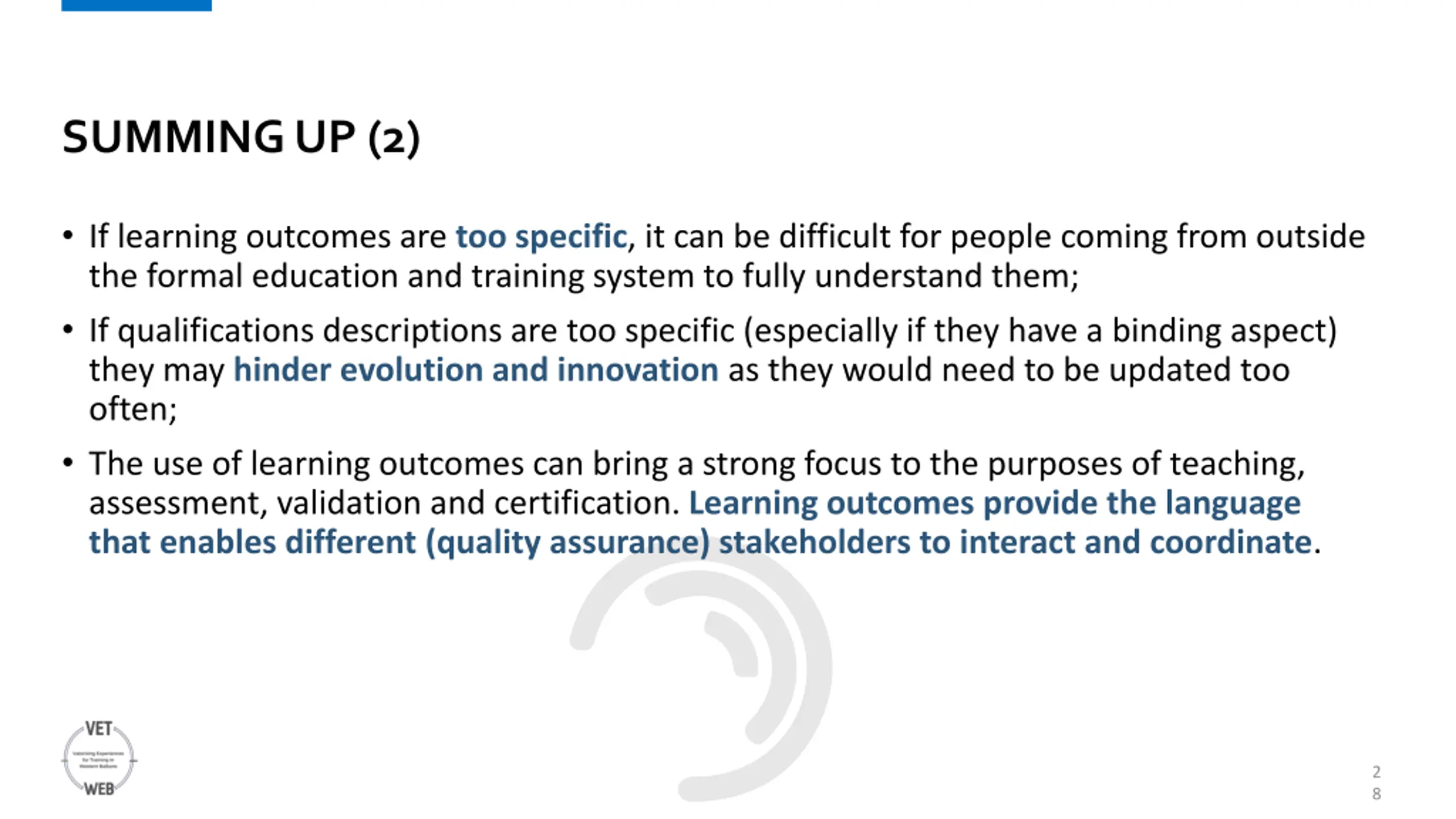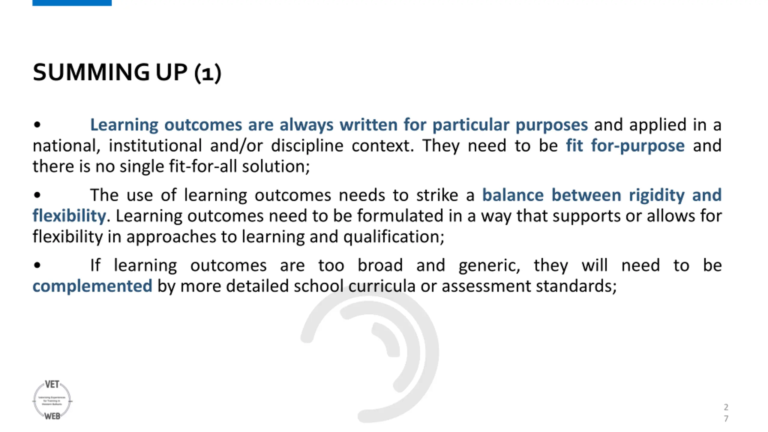SUMMING UP (1) national, institutional and/or discipline context. They need to be fit for-purpose and there is no single fit-for-all solution; Learning outcomes are always written for particular purposes and applied in a flexibility. Learning outcomes need to be formulated in a way that supports or allows for flexibility in approaches to learning and qualification; If learning outcomes are too broad and generic, they will need to be complemented by more detailed school curricula or assessment standards; The use of learning outcomes needs to strike a balance between rigidity and 2 7