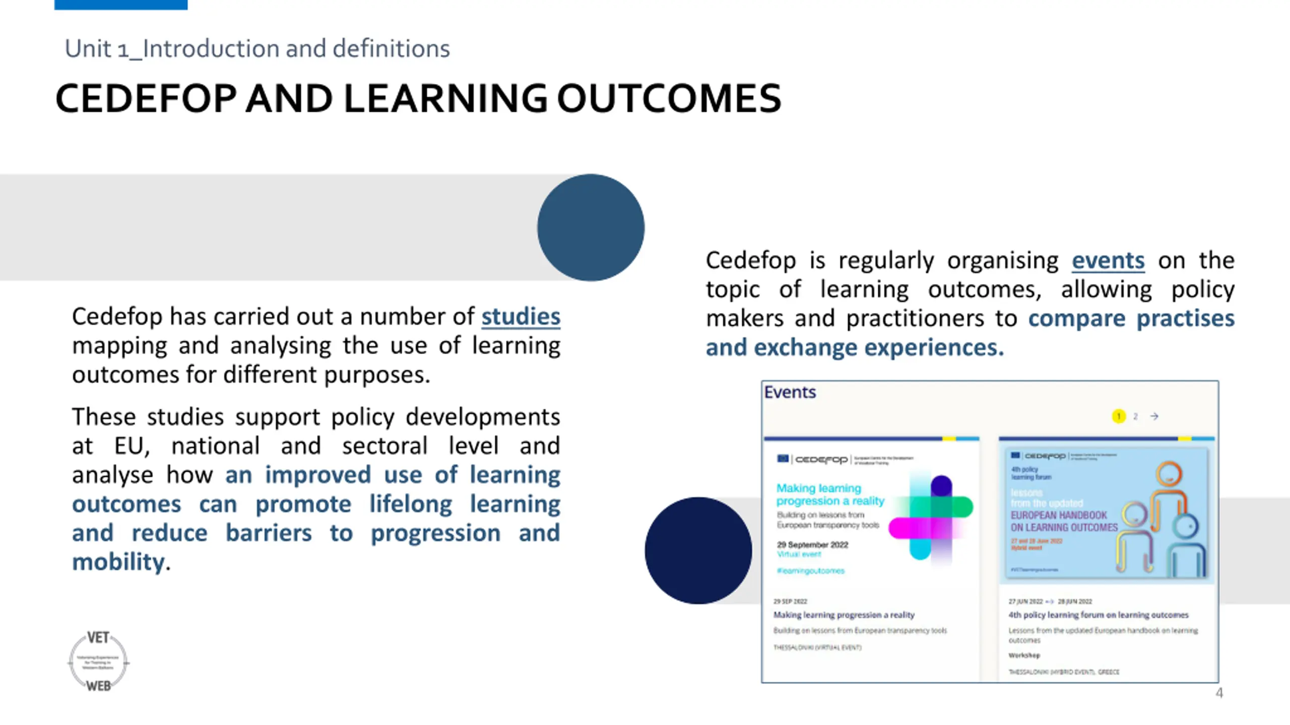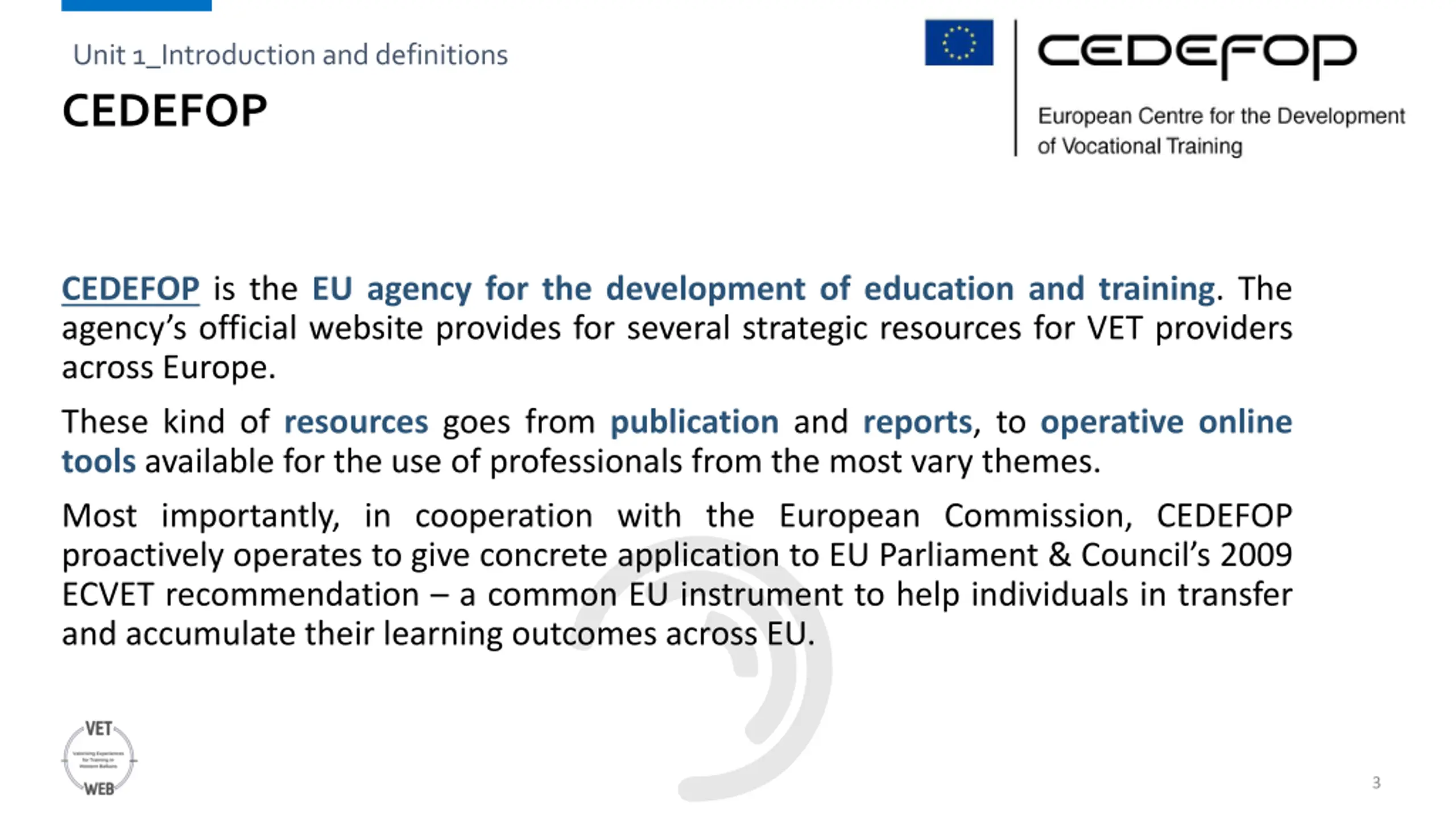 Unit 1_Introduction and definitions CEDEFOP CEDEFOP is the EU agency for the development of education and training. The agency s official website provides for several strategic resources for VET providers across Europe. These kind of resources goes from publication and reports, to operative online tools available for the use of professionals from the most vary themes. Most importantly, in cooperation with the European Commission, CEDEFOP proactively operates to give concrete application to EU Parliament & Council s 2009 ECVET recommendation a common EU instrument to help individuals in transfer and accumulate their learning outcomes across EU. 3
