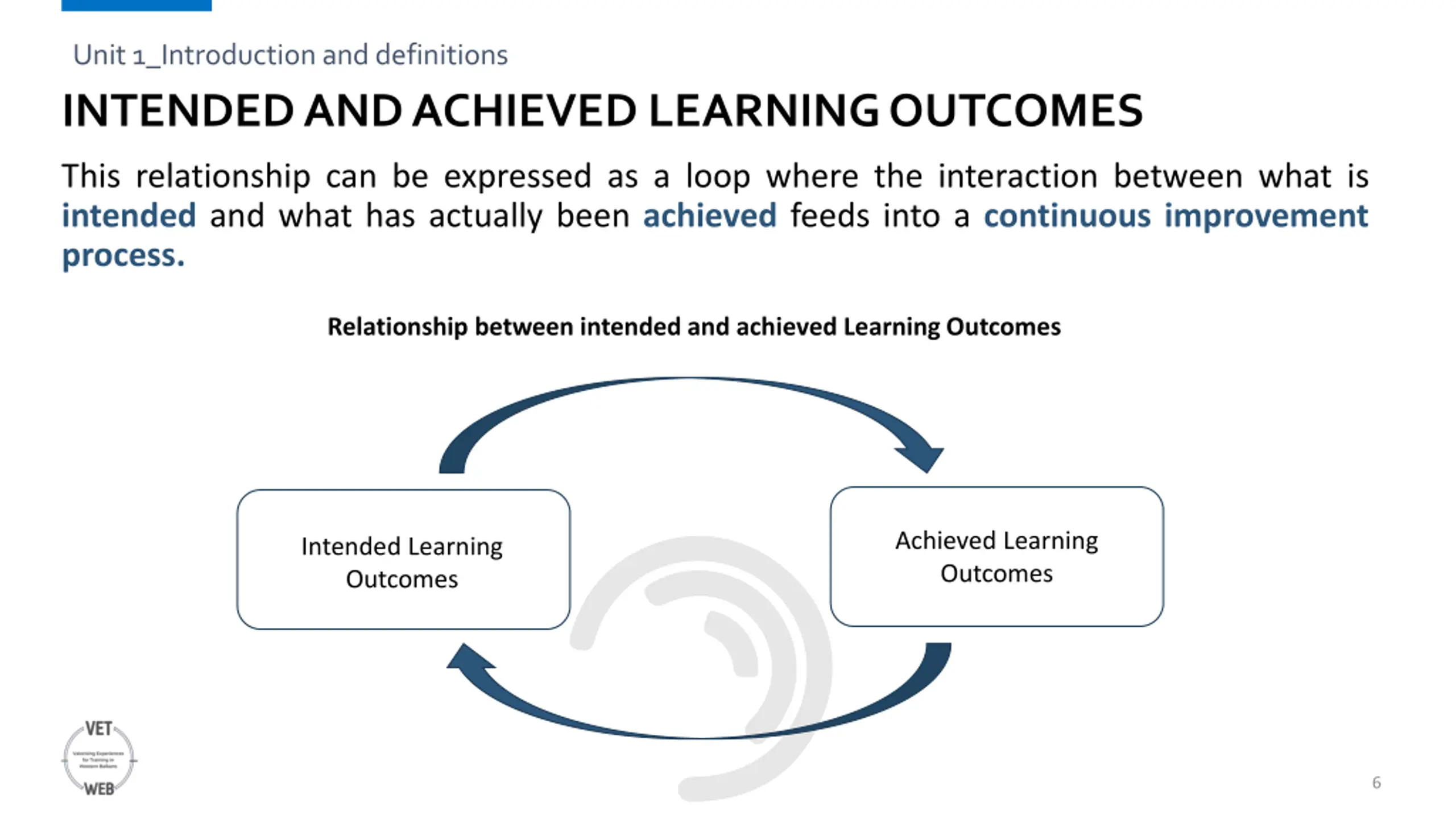 Unit 1_Introduction and definitions INTENDED AND ACHIEVED LEARNING OUTCOMES This relationship can be expressed as a loop where the interaction between what is intended and what has actually been achieved feeds into a continuous improvement process. Relationship between intended and achieved Learning Outcomes Achieved Learning Outcomes Intended Learning Outcomes 6