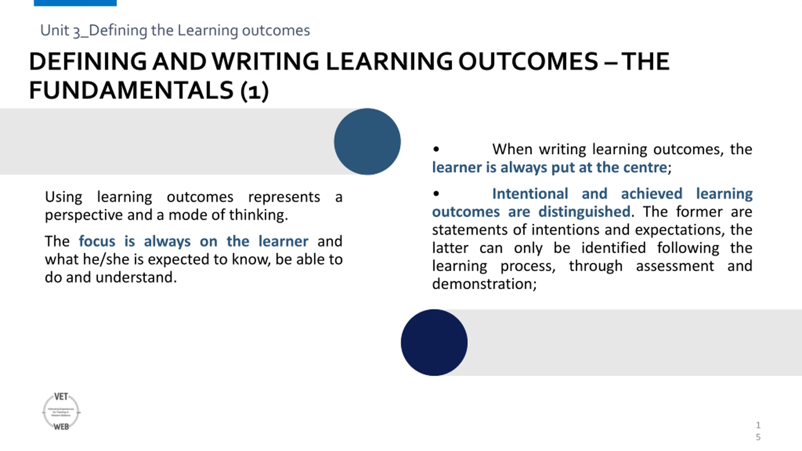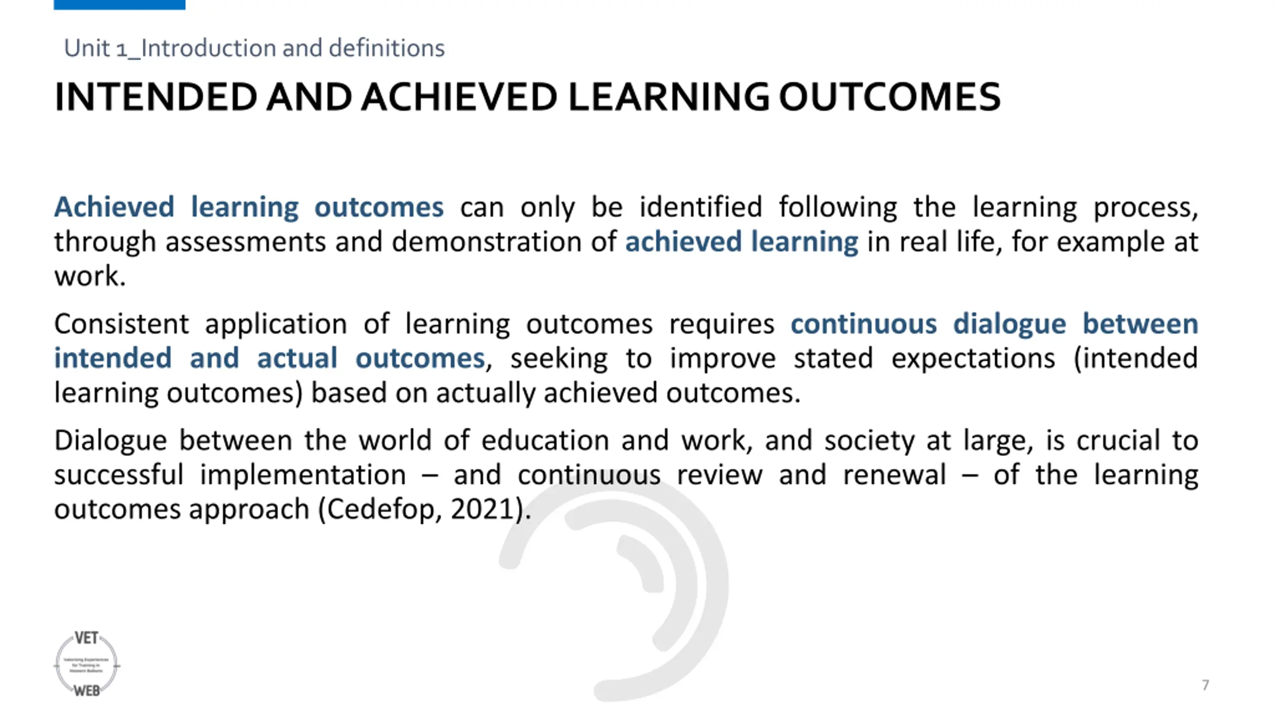 Unit 1_Introduction and definitions INTENDED AND ACHIEVED LEARNING OUTCOMES Achieved learning outcomes can only be identified following the learning process, through assessments and demonstration of achieved learning in real life, for example at work. Consistent application of learning outcomes requires continuous dialogue between intended and actual outcomes, seeking to improve stated expectations (intended learning outcomes) based on actually achieved outcomes. Dialogue between the world of education and work, and society at large, is crucial to successful implementation and continuous review and renewal of the learning outcomes approach (Cedefop, 2021). 7