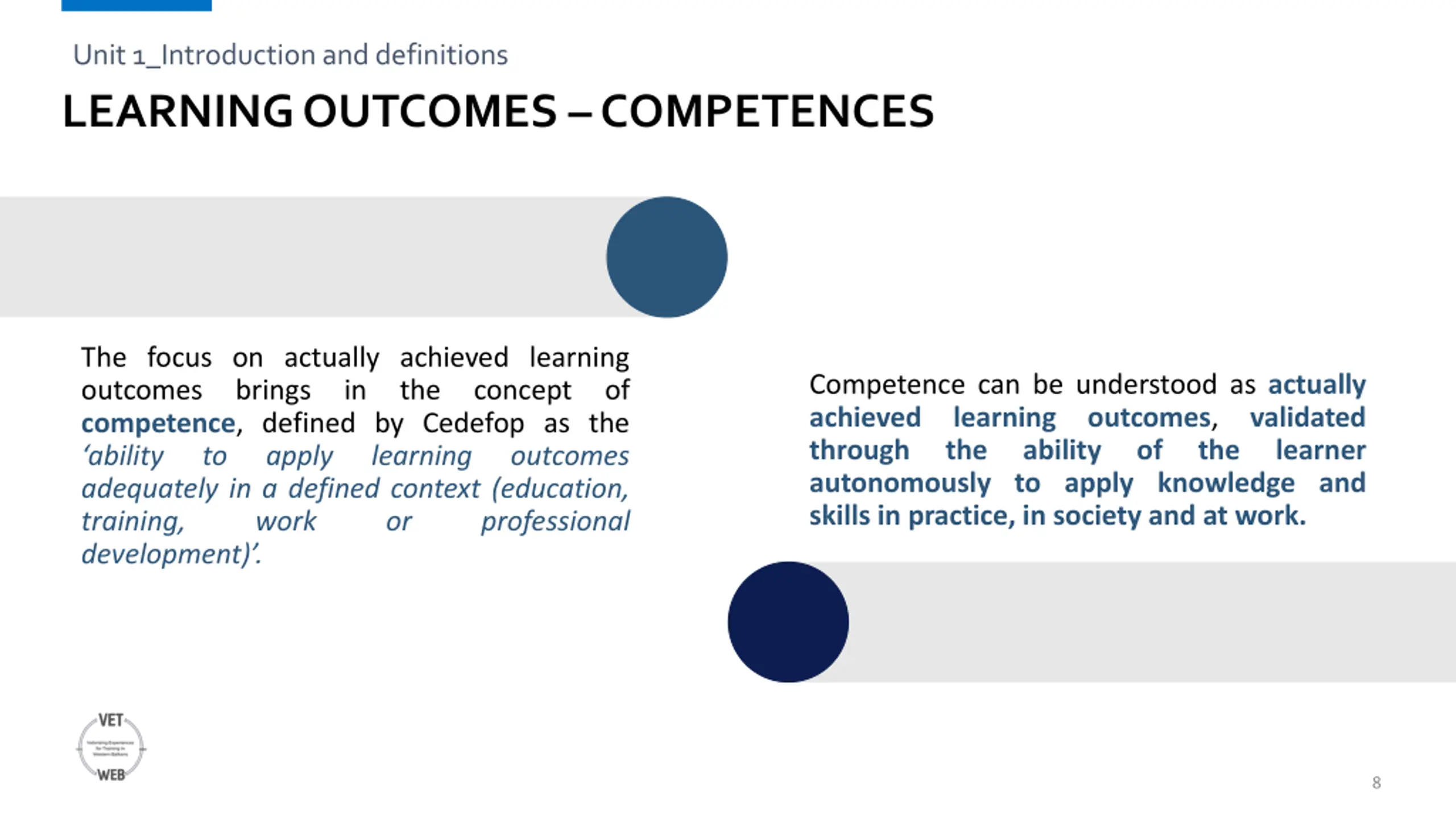 Unit 1_Introduction and definitions LEARNING OUTCOMES COMPETENCES The focus on actually achieved learning outcomes brings in competence, defined by Cedefop as the ability to apply adequately in a defined context (education, training, work development) . Competence can be understood as actually achieved learning outcomes, through the ability autonomously to apply knowledge and skills in practice, in society and at work. the concept of validated learner of the learning outcomes or professional 8