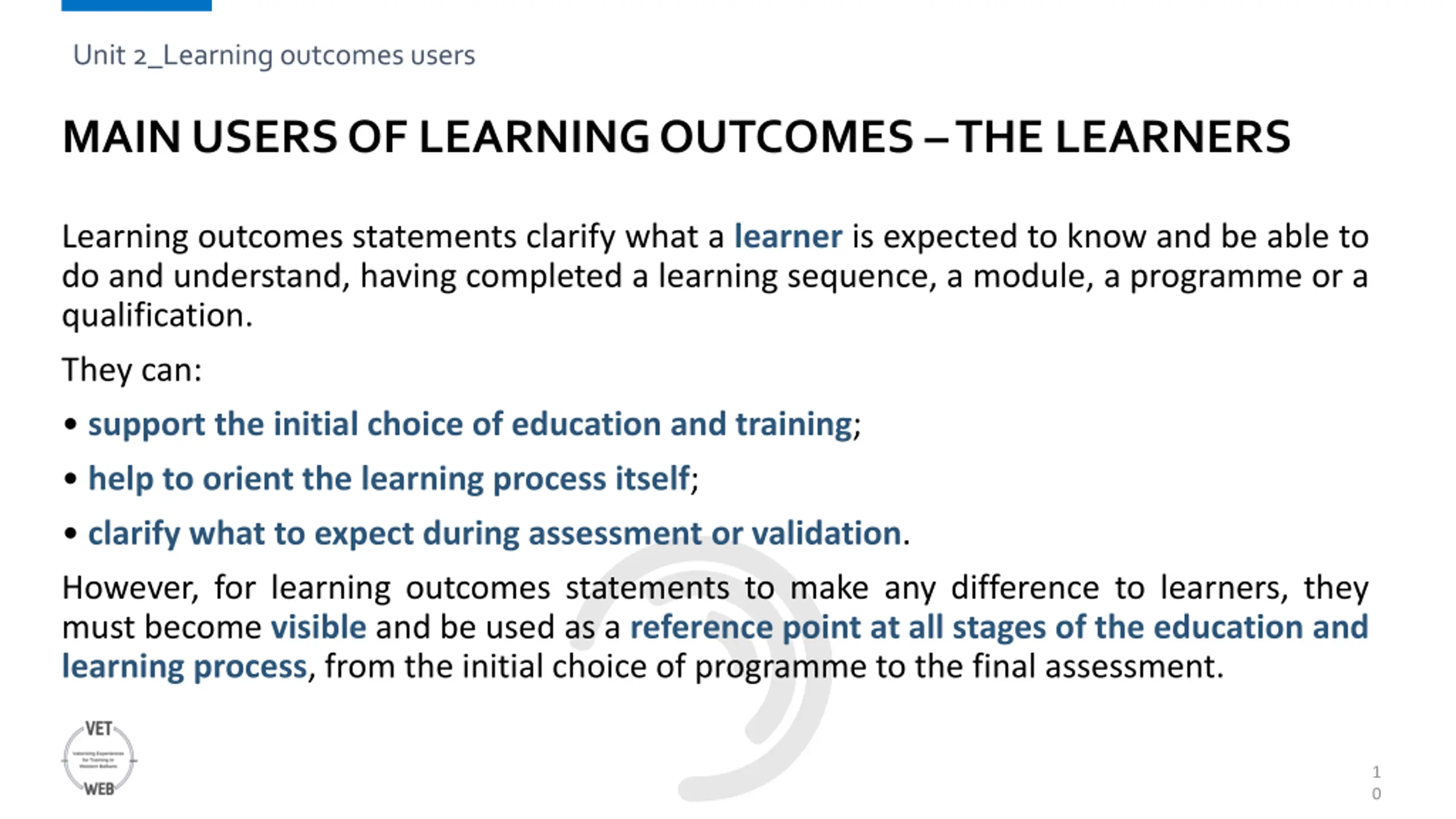 Unit 2_Learning outcomes users MAIN USERS OF LEARNING OUTCOMES THE LEARNERS Learning outcomes statements clarify what a learner is expected to know and be able to do and understand, having completed a learning sequence, a module, a programme or a qualification. They can: support the initial choice of education and training; help to orient the learning process itself; clarify what to expect during assessment or validation. However, for learning outcomes statements to make any difference to learners, they must become visible and be used as a reference point at all stages of the education and learning process, from the initial choice of programme to the final assessment. 1 0