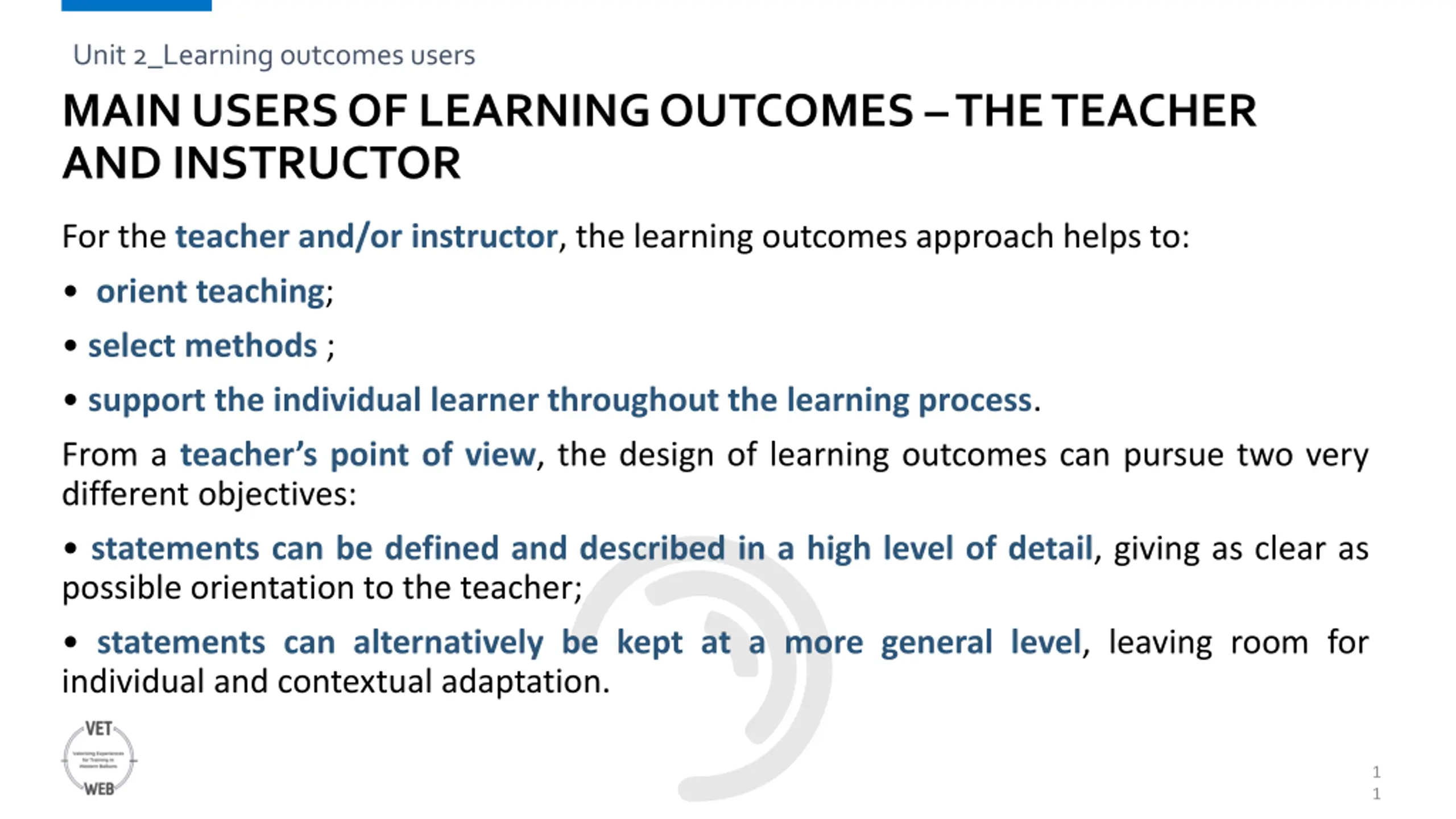 Unit 2_Learning outcomes users MAIN USERS OF LEARNING OUTCOMES THE TEACHER AND INSTRUCTOR For the teacher and/or instructor, the learning outcomes approach helps to: orient teaching; select methods ; support the individual learner throughout the learning process. From a teacher s point of view, the design of learning outcomes can pursue two very different objectives: statements can be defined and described in a high level of detail, giving as clear as possible orientation to the teacher; statements can alternatively be kept at a more general level, leaving room for individual and contextual adaptation. 1 1