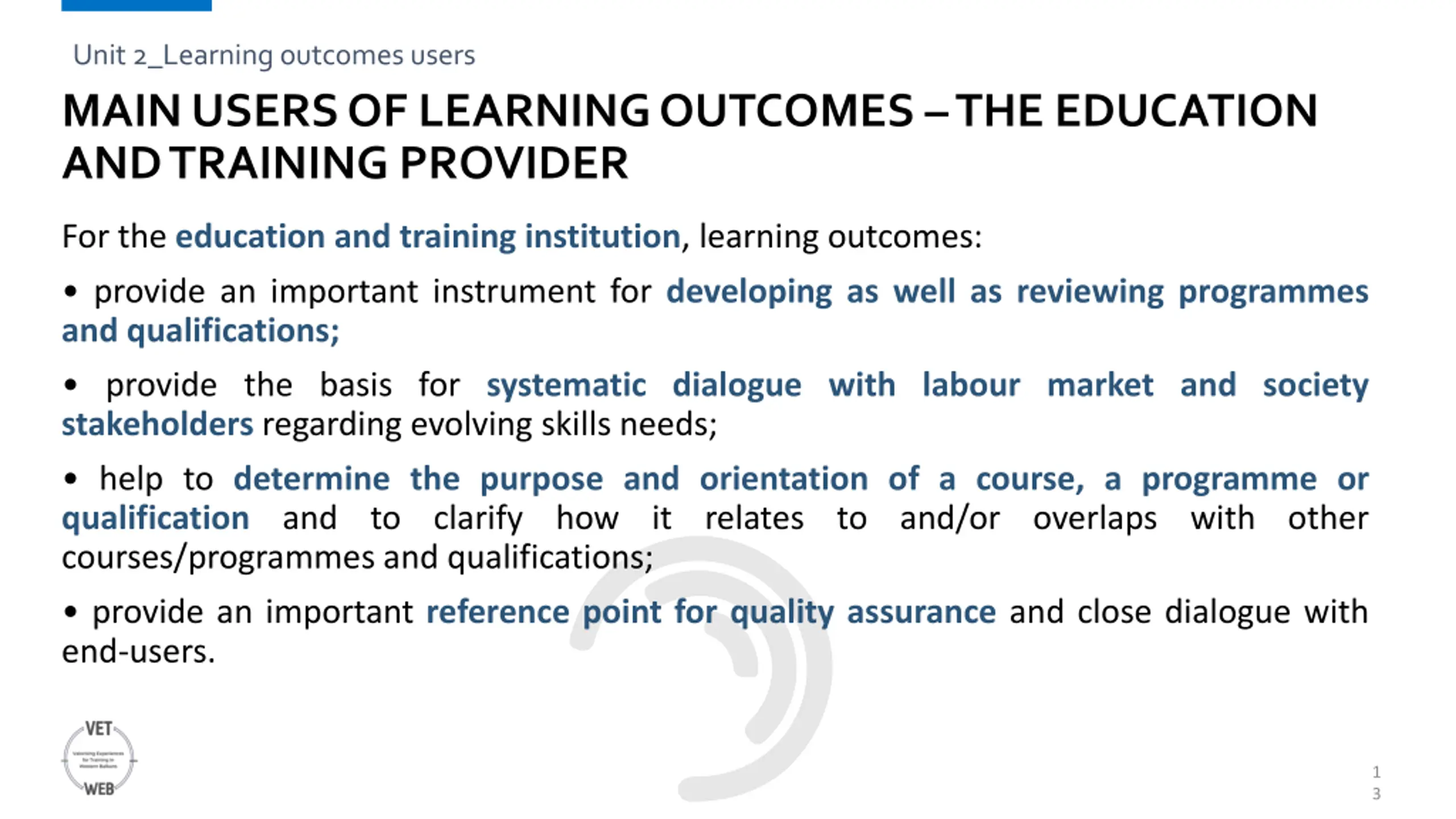 Unit 2_Learning outcomes users MAIN USERS OF LEARNING OUTCOMES THE EDUCATION AND TRAINING PROVIDER For the education and training institution, learning outcomes: provide an important instrument for developing as well as reviewing programmes and qualifications; provide the basis for systematic dialogue with labour market and society stakeholders regarding evolving skills needs; help to determine the purpose and orientation of a course, a programme or qualification and to clarify how it relates to and/or overlaps with other courses/programmes and qualifications; provide an important reference point for quality assurance and close dialogue with end-users. 1 3