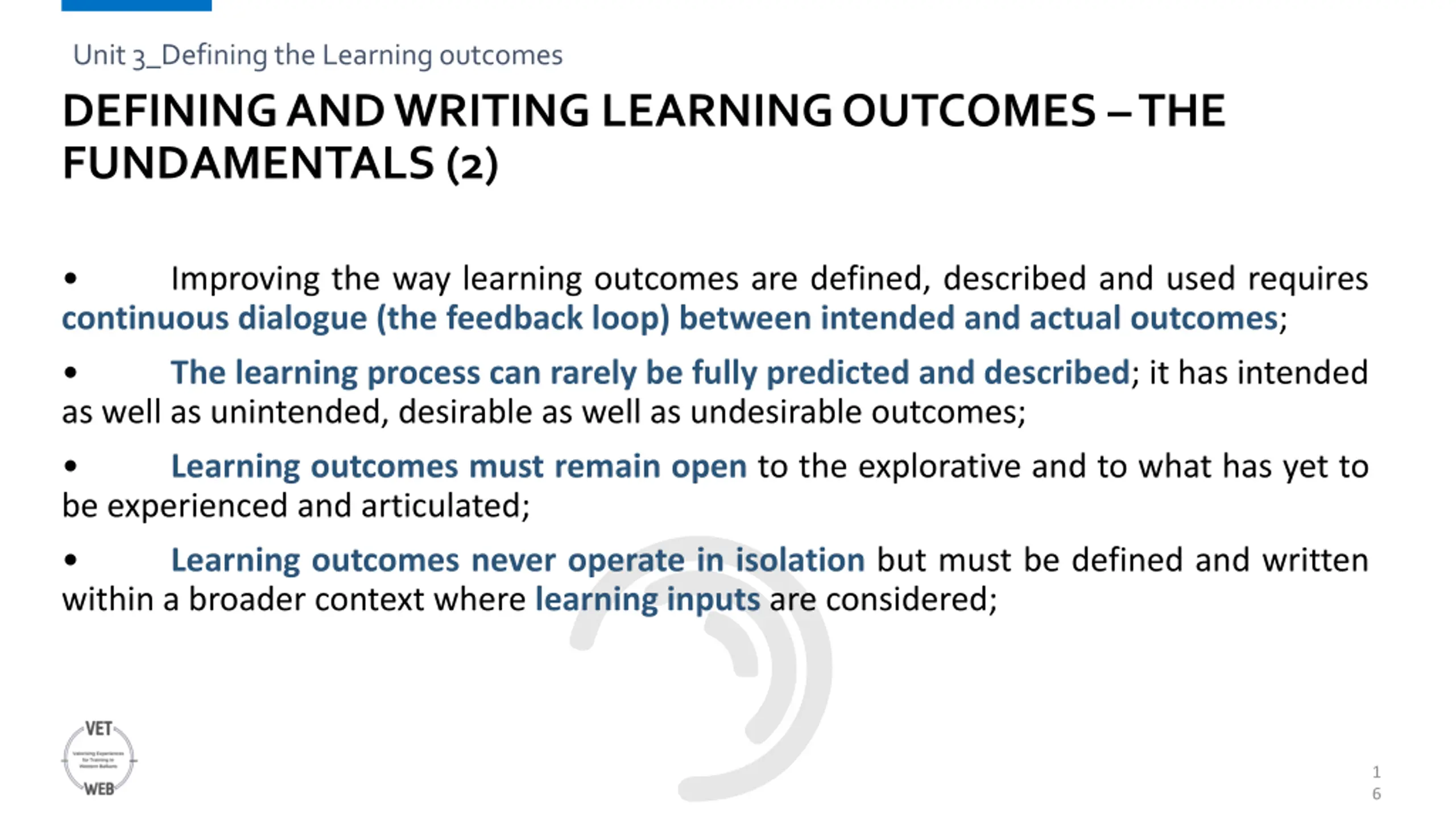 Unit 3_Defining the Learning outcomes DEFINING AND WRITING LEARNING OUTCOMES THE FUNDAMENTALS (2) continuous dialogue (the feedback loop) between intended and actual outcomes; Improving the way learning outcomes are defined, described and used requires as well as unintended, desirable as well as undesirable outcomes; Learning outcomes must remain open to the explorative and to what has yet to be experienced and articulated; Learning outcomes never operate in isolation but must be defined and written within a broader context where learning inputs are considered; The learning process can rarely be fully predicted and described; it has intended 1 6