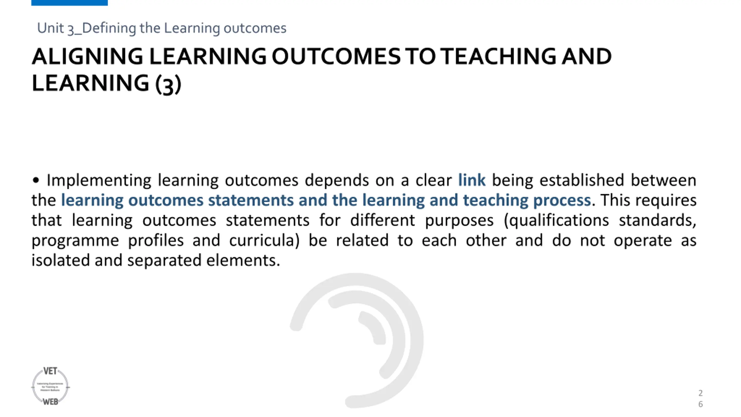 Unit 3_Defining the Learning outcomes ALIGNING LEARNING OUTCOMES TO TEACHING AND LEARNING (3) Implementing learning outcomes depends on a clear link being established between the learning outcomes statements and the learning and teaching process. This requires that learning outcomes statements for different purposes (qualifications standards, programme profiles and curricula) be related to each other and do not operate as isolated and separated elements. 2 6