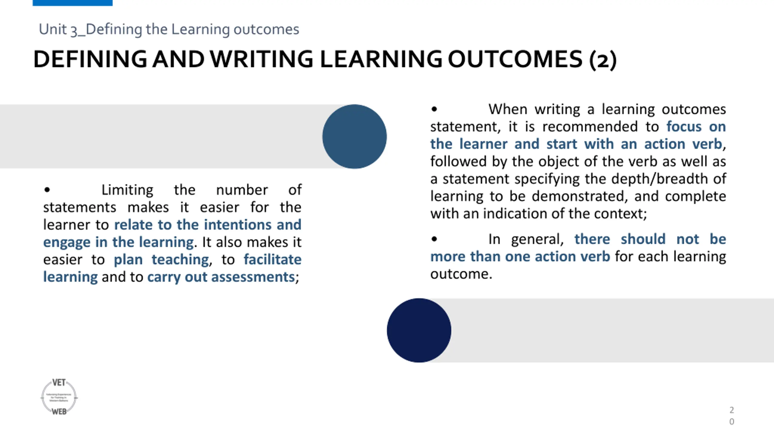 Unit 3_Defining the Learning outcomes DEFINING AND WRITING LEARNING OUTCOMES (2) statement, it is recommended to focus on the learner and start with an action verb, followed by the object of the verb as well as a statement specifying the depth/breadth of learning to be demonstrated, and complete with an indication of the context; When writing a learning outcomes statements makes it easier for the learner to relate to the intentions and engage in the learning. It also makes it easier to plan teaching, to facilitate learning and to carry out assessments; Limiting the number of more than one action verb for each learning outcome. In general, there should not be 2 0