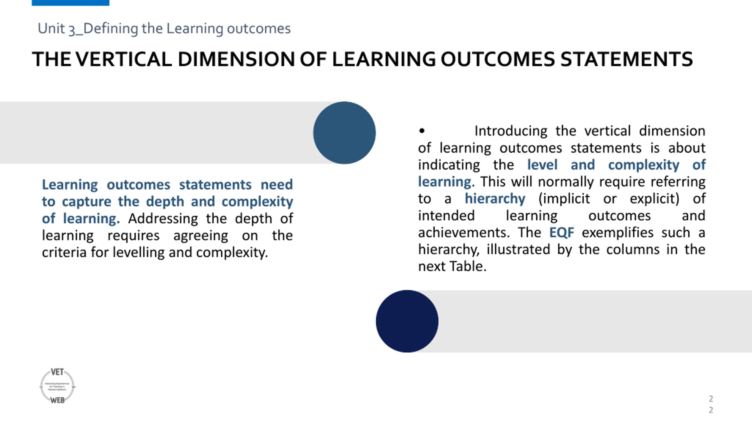 Unit 3_Defining the Learning outcomes THE VERTICAL DIMENSION OF LEARNING OUTCOMES STATEMENTS of learning outcomes statements is about indicating the level and complexity of learning. This will normally require referring to a hierarchy (implicit or explicit) of intended learning achievements. The EQF exemplifies such a hierarchy, illustrated by the columns in the next Table. Introducing the vertical dimension Learning outcomes statements need to capture the depth and complexity of learning. Addressing the depth of learning requires agreeing on the criteria for levelling and complexity. outcomes and 2 2