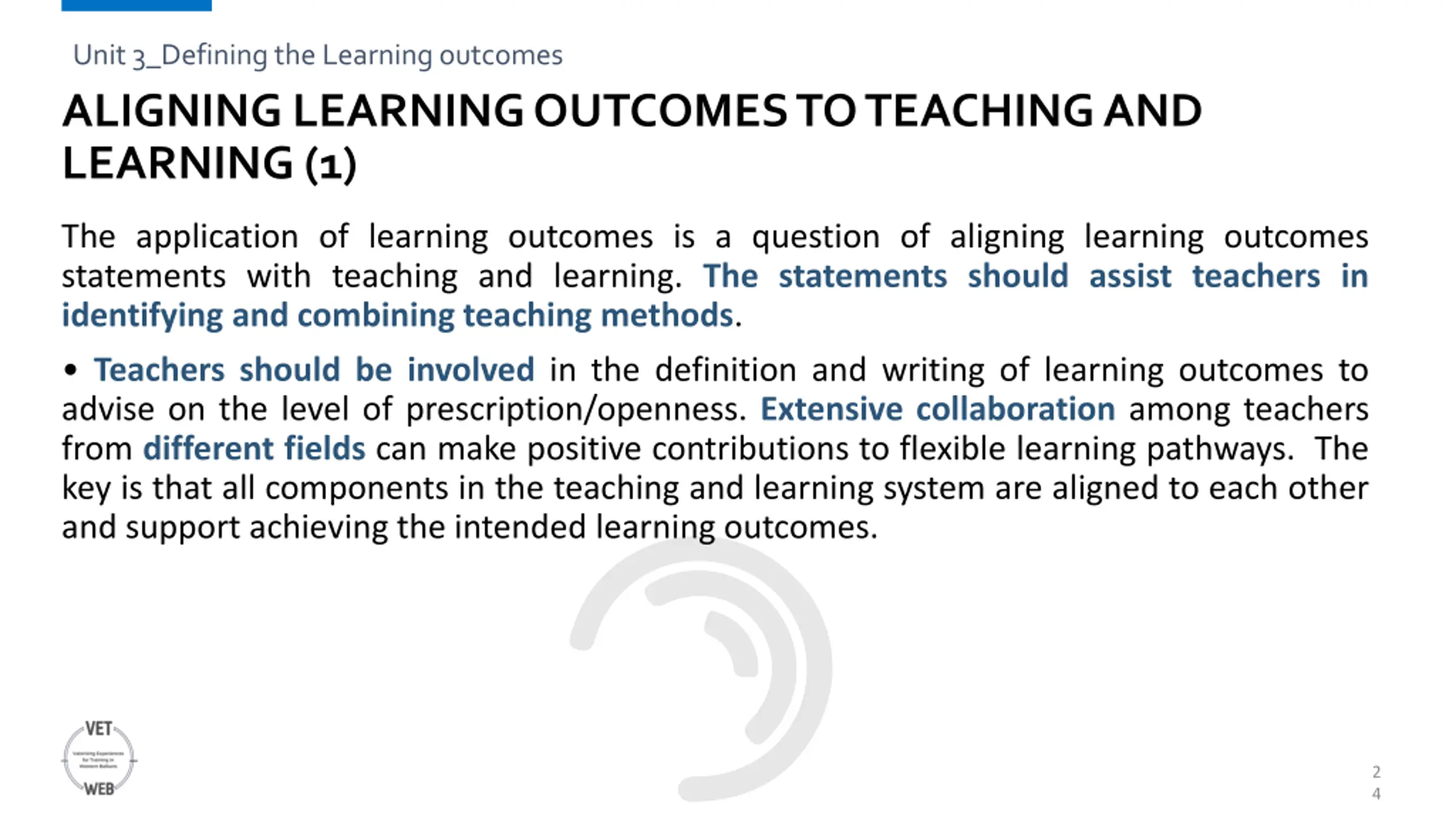 Unit 3_Defining the Learning outcomes ALIGNING LEARNING OUTCOMES TO TEACHING AND LEARNING (1) The application of learning outcomes is a question of aligning learning outcomes statements with teaching and learning. The statements should assist teachers in identifying and combining teaching methods. Teachers should be involved in the definition and writing of learning outcomes to advise on the level of prescription/openness. Extensive collaboration among teachers from different fields can make positive contributions to flexible learning pathways. The key is that all components in the teaching and learning system are aligned to each other and support achieving the intended learning outcomes. 2 4